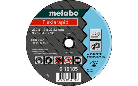 Deutschland 07022/720 Metabo Flexiarapid 115x1,0x22,23 Inox, TF 41 (616186000) Artikel-Nr.: 616186000 EAN: 4007430445421 Hersteller: METABO