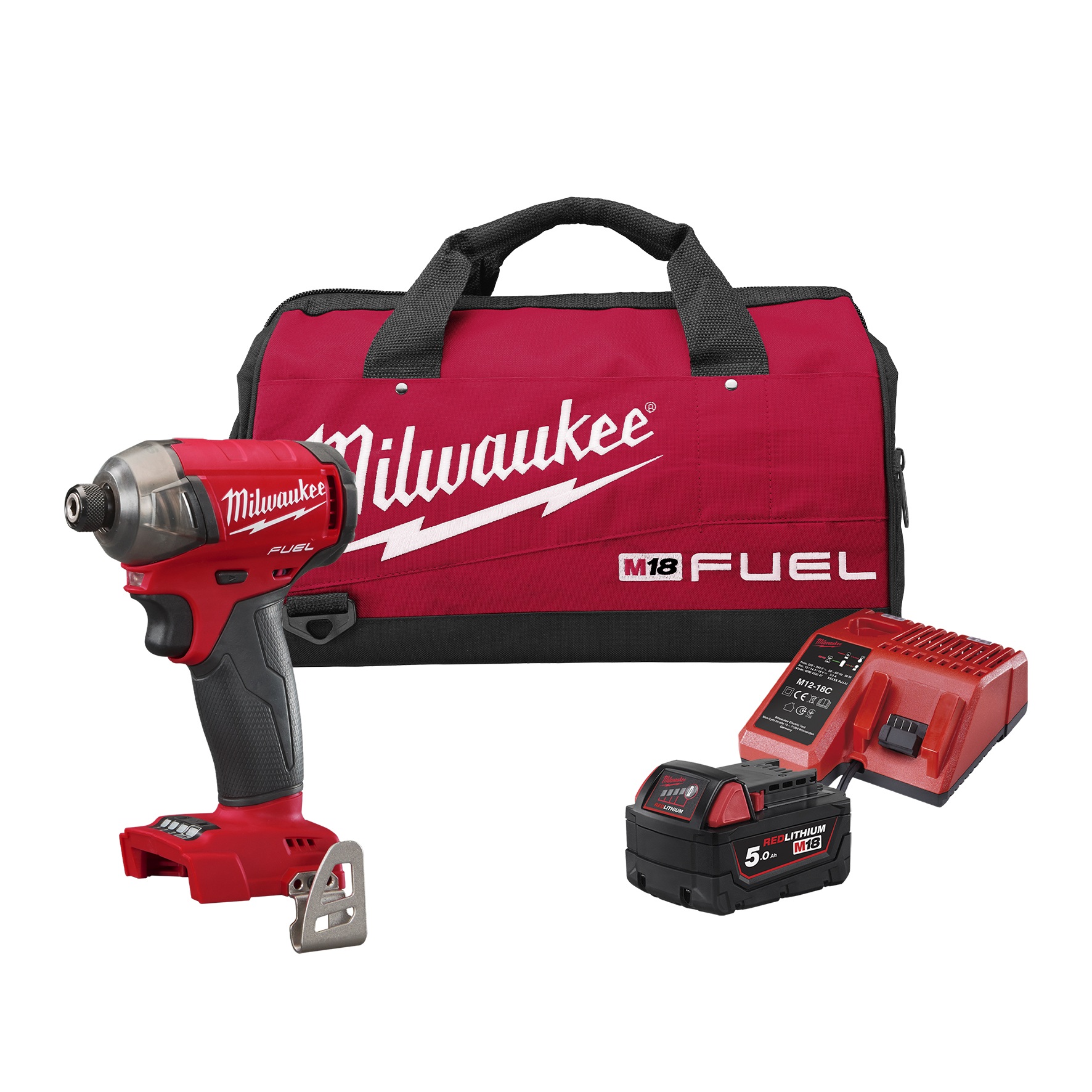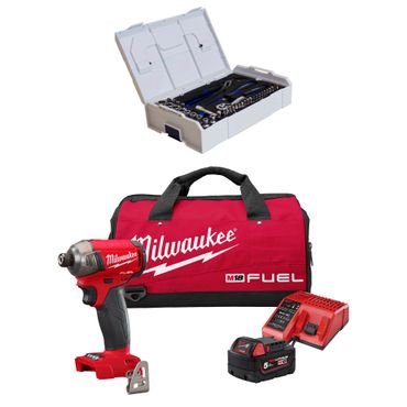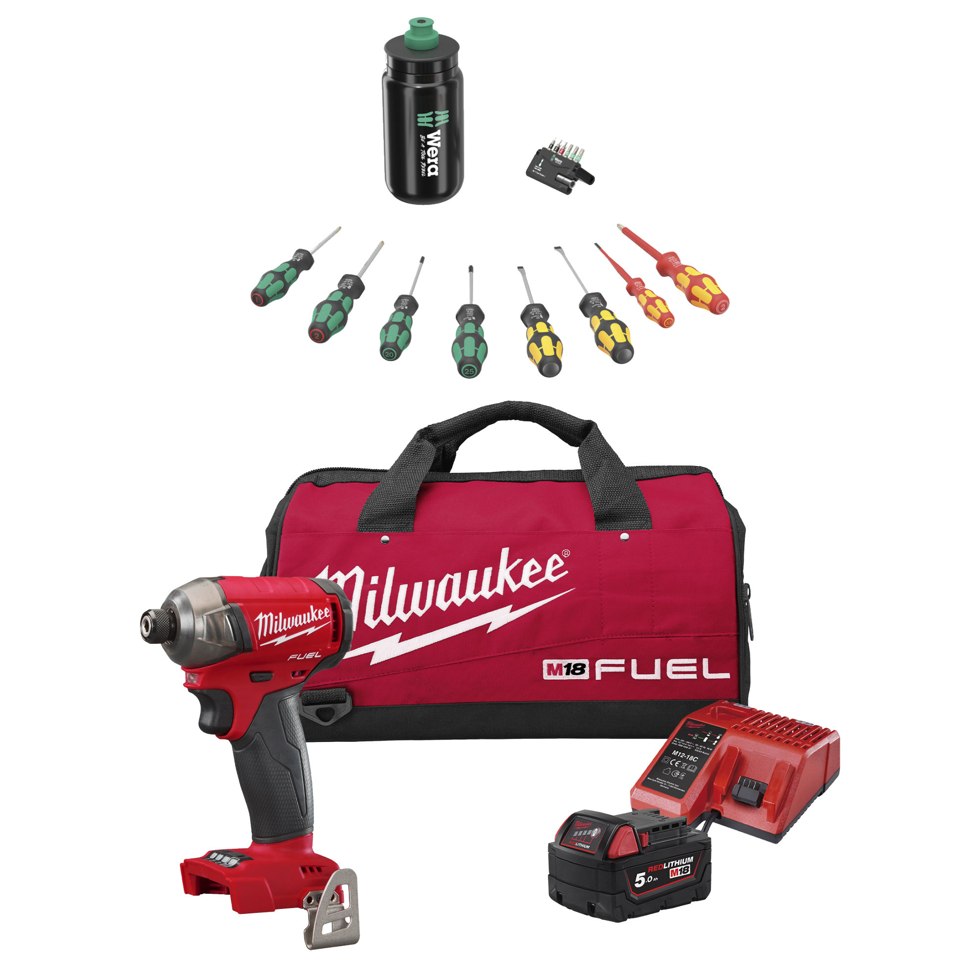 Milwaukee M18 FEUEL Akku-Schlagschrauber M18 FQID-501B, 1x 5,0 Ah und Ladegerät + Wera Schraubwerkzeug-Set mit Flasche