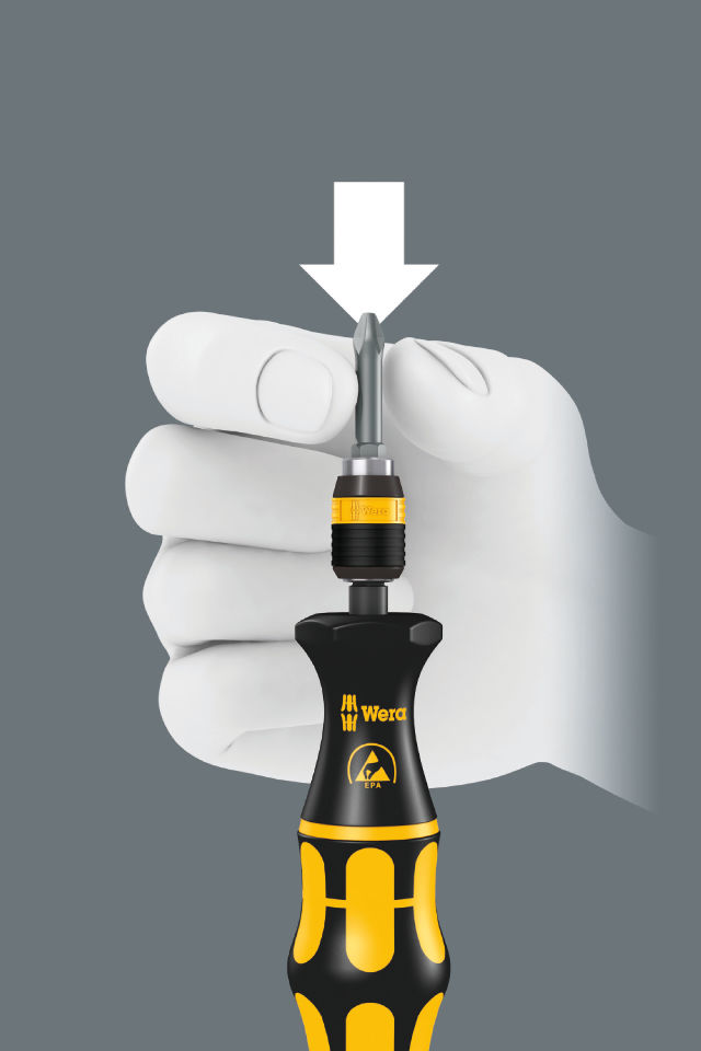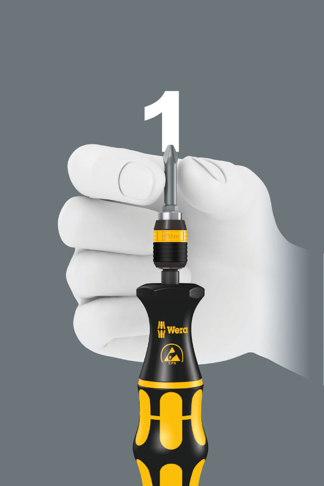 Produkteigenschaften: Hochwertiger Bit-Handhalter für elektrostatisch sicheres Arbeiten: Der elektrische Oberflächenwiderstand des Wera ESD Materials liegt bei 106 - 109 Ohm So werden Bauteile vor elektrostatischer Energie und damit verbundenen Schäden sicher geschützt Das Schnellwechselfutter Rapidaptor ermöglicht blitzschnellen Bitwechsel ohne Hilfswerkzeug Kraftform Plus Griff für angenehm ergonomisches Arbeiten, bei dem Blasen und Schwielen vermieden werden Harte Griffzonen für hohe Arbeitsgeschwindigkeit, während weiche Griffzonen hohe Drehmomentübertragung garantieren Geeignet für Bits mit 1/4"-Außensechskantantrieb nach DIN ISO 1173-C 6,3 und E 6,3 (ISO 1173) ESD Bits-Handhalter für elektrostatisch sicheres Arbeiten Oberflächenwiderstand von ≤ 10<sup>9</sup> Ohm Mehrkomponentiger Kraftform Griff für schnelles und ergonomisches Verschrauben Mit Sechskantabrollschutz gegen Wegrollen 1/4" Innensechskantaufnahme mit Rapidaptor SchnellwechselfutterTechnische Daten: Abmessung: 90x22x22 mm Gewicht: 39 gLieferumfang: 1x Wera 813 R Bits-Handhalter ESD, unmagnetisch 1/4x90