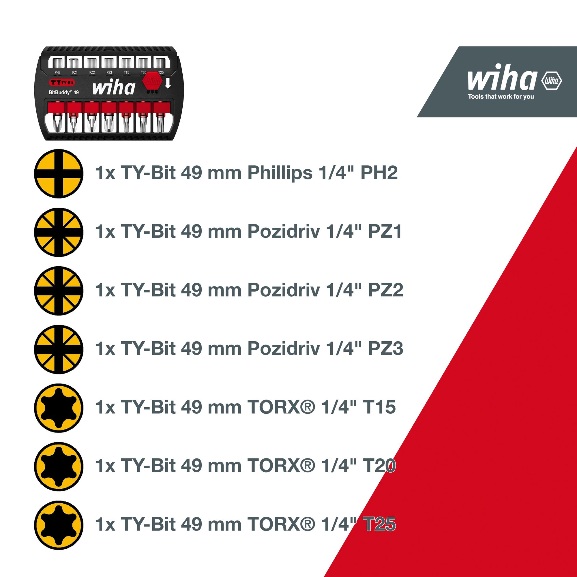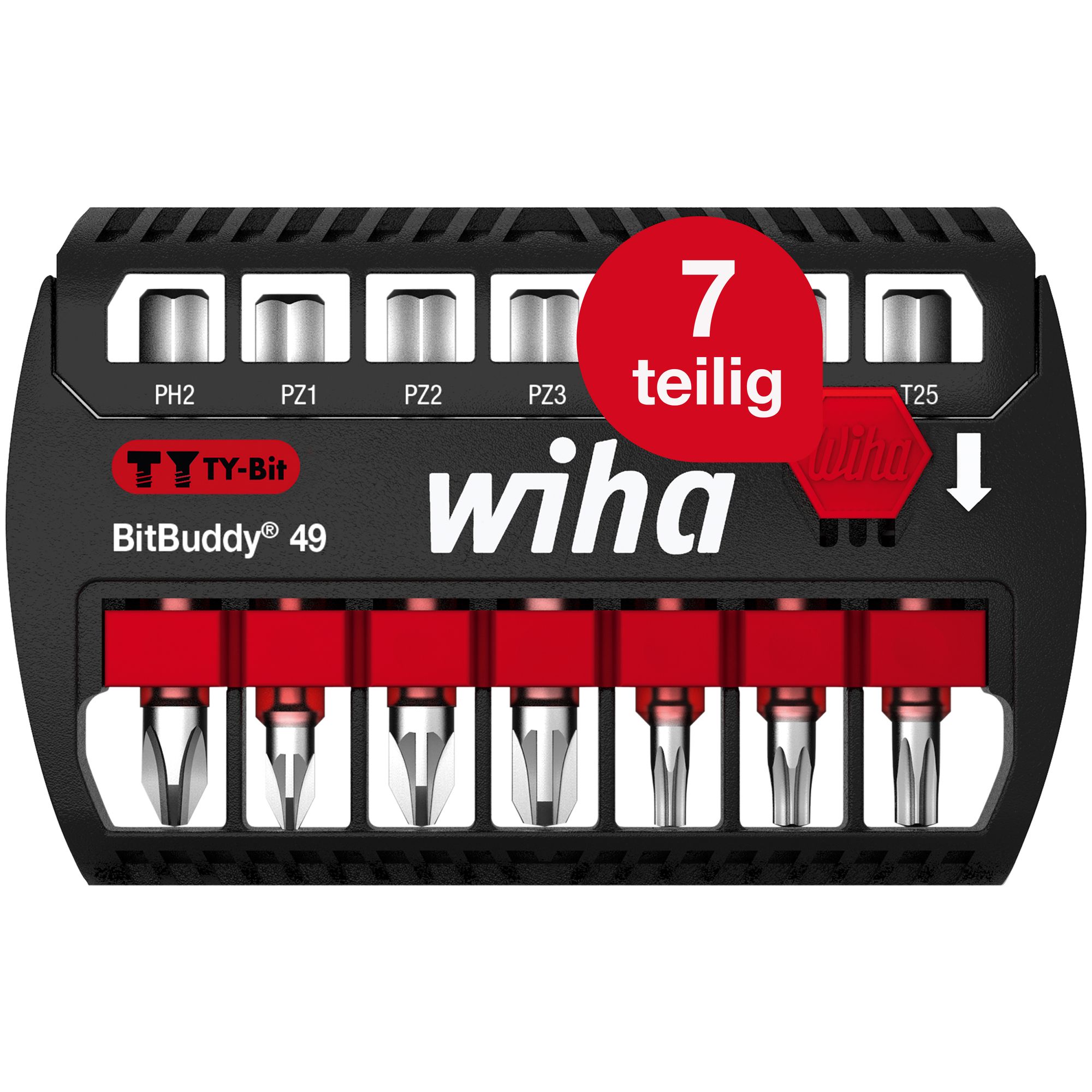 Produkteigenschaften:Keine Hand frei und das lästige Suchen nach dem richtigen Bit satt? Der Wiha BitBuddy® ermöglicht die direkte Aufnahme der Bits in der Maschine sowie das einfache Zurückführen in den Halter. Dank der neuartigen Anordnung der Bits in der Halterung sowie der gelaserten Profilgröße auf dem Bitboden wird die Auswahl der richtigen Größe bei der Bitentnahme zum Kinderspiel. Der enthaltene TY-Bit ist als Multitalent für alle Arten von Schrauben, sowohl für T-förmige als auch Y-förmige Schrauben, geeignet und somit das ideale Werkzeug für Verschraubungen in allen Materialen. Dank der patentierten, verlängerten Torsionszone ist der Bit auch für Impact- und Schlagschrauber geeignet und garantiert eine 120x höhere Lebensdauer im Vergleich zu den Wiha Standardbits. Zudem sind die farbigen Bits schnell und einfach auffindbar und dank des Farbmantels auch im Dunkeln mit UV-Licht gut zu finden.Anwendung: Für alle Arten von Schrauben geeignet. Auch für Impact- und Schlagschrauber geeignet.DURCHDACHTES KONZEPT: Direkte Aufnahme der Bits in der Maschine sowie das einfache Zurückführen in den HalterEFFIZIENZ: Der Spezialist mit 120x höhrerer Lebensdauer* durch optimierten Bit für alle Schrauben (*im Vergleich zu Wiha Standardbit)SENKT IHRE KOSTEN: Bit dank roter Farbmakierung schnell und einfach auffindbar - mit UV Licht sogar in dunkler UmgebungZEITSPAREND: Kein langes Suchen dank leuchtend farbigem Bit, geringe Bitwechselzeit dank hoher Lebensdauer. Automatische nung auf Knopfdruck und einfacher Bitwechsel direkt im HalterUNIVERSELL: Dank der patentierten, verlängerten Torsionszone ist der Bit auch für Impact- und Schlagschrauber geeignetTechnische Daten:Werkzeug für Elektrik: NeinSB - Verpackung: JaESD Artikel: Neinmit Batterie / Akku: NeinLieferumfang:Wiha Bit Set BitBuddy® TY-Bit 49 mm Phillips, Pozidriv, TORX® 7-tlg. 1/4" E6,3 (42116):1x TY-Bit 49 mm Phillips 1/4" PH21x TY-Bit 49 mm Pozidriv 1/4" PZ11x TY-Bit 49 mm Pozidriv 1/4" PZ21x TY-Bit 49 mm Pozidriv 1/4" PZ31x TY-Bit 49 mm TORX® 1/4" T151x TY-Bit 49 mm TORX® 1/4" T201x TY-Bit 49 mm TORX® 1/4" T251x BitBuddy®