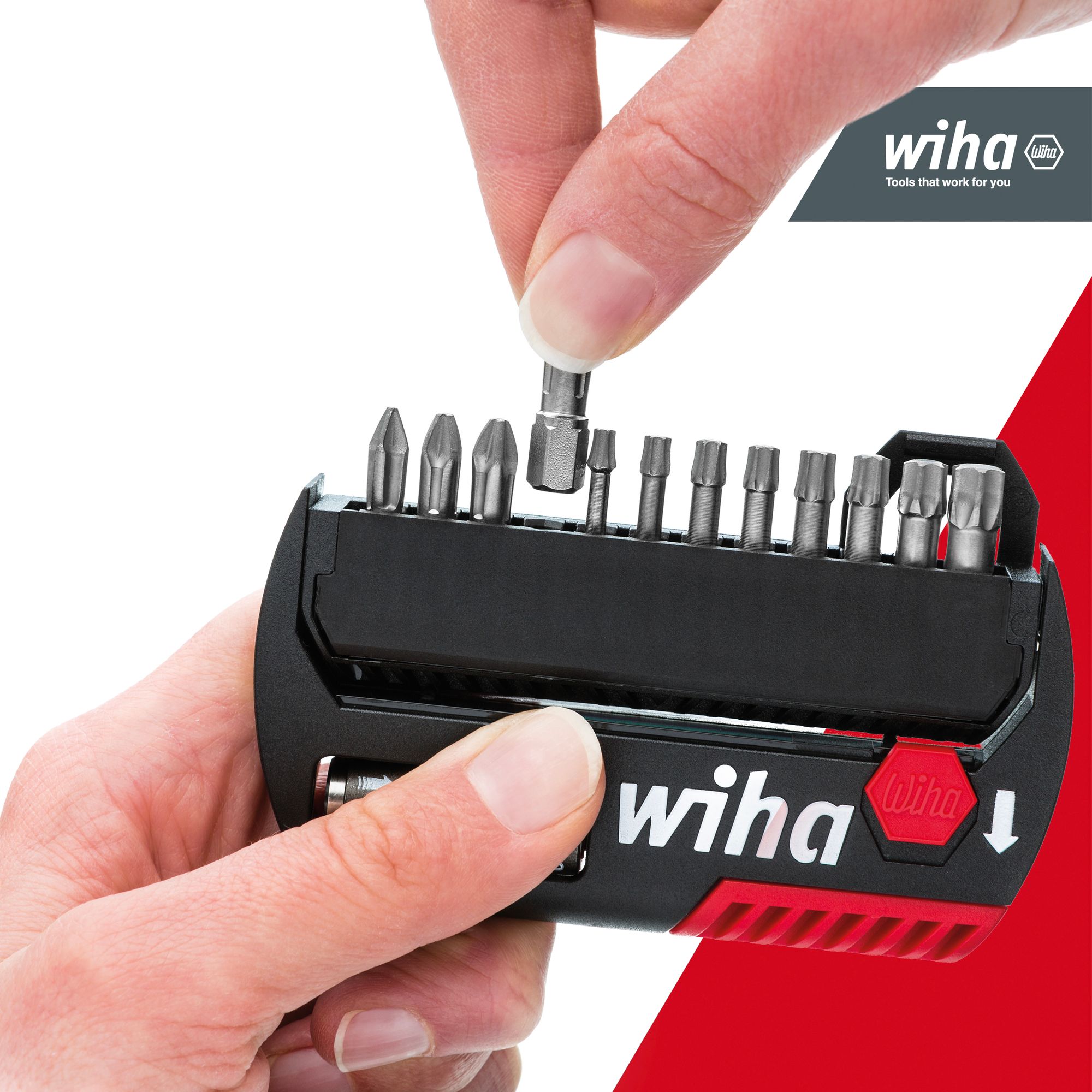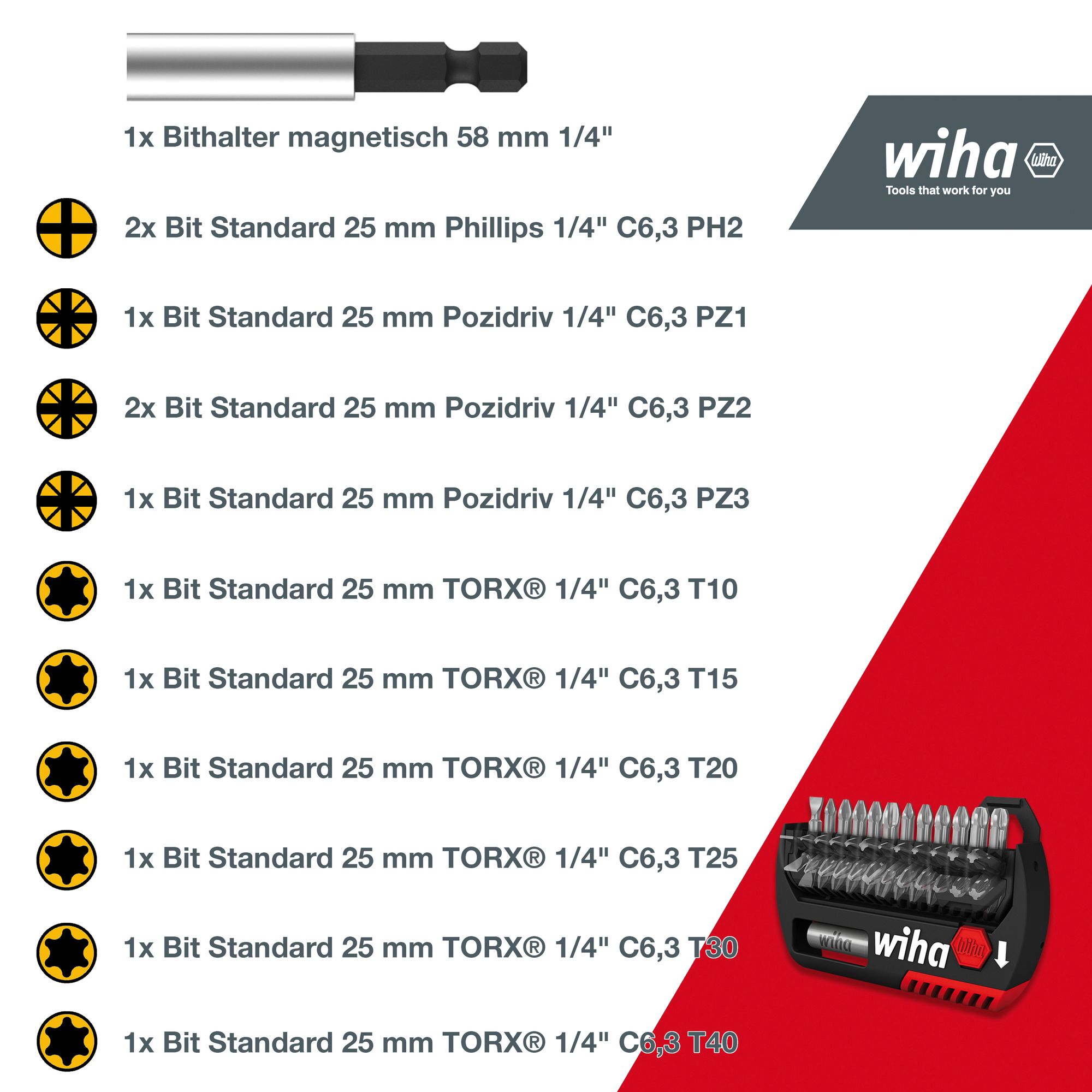 Produkteigenschaften:DURCHDACHTES KONZEPT: Bewährtes und platzsparendes Design. Extra Klappelement für magnetischen Bithalter. Bit-Klemmelement 180° schwenkbar für einfach Entnahme der Profi BitsGRIFFBEREIT: Das Bitsortiment mit den Profi Bits für Akkuschrauber passt in die Hosentasche oder an den GürtelclipEFFIZIENT: Alle gängigen 25 mm Bits in der robusten Bitbox enthaltenKOMPAKT: Bit Set für den mobilen Einsatz. Geeignet für Verschraubungen in Holz und weichen MaterialienBITHALTER: Die Bithalter Box beinhaltet zusätzlich einen magnetischen Universalhalter 1/4 ZollGehäuse: Extra Klappelement für den magnetischen Bithalter. Box aus schlagzähem, glasfaserverstärktem Polyamid - dauerhaft robust. Bit-Klemmelement 180° schwenkbar.Normen: DIN 3126, ISO 1173, Form C6,3Extra: Millionenfach bewährtes Design. Immer griffbereit - passt locker in die Hosentasche oder den Gürtelclip.Anwendung: Kompakte Bit Box mit 13 teiligem Bitsatz. Wiha Logo nach unten schieben - und schon sind die Bits zur Entnahme bereit. Besonders geeignet für Verschraubungen in Holz und weichen Materialien.Bithalter: Universalhalter 1/4", magnetisch.Bits: 25 mm-BitsTechnische Daten:Werkzeug für Elektrik: NeinSB - Verpackung: JaESD Artikel: Neinmit Batterie / Akku: NeinLieferumfang:Wiha Bit Set FlipSelector Standard 25 mm PH, PZ, TORX® 13-tlg. 1/4" C6,3 mit Gürtelclip (39060):2x Bit Standard 25 mm Phillips 1/4" C6,3 PH2 (01658)1x Bit Standard 25 mm Pozidriv 1/4" C6,3 PZ1 (01688)2x Bit Standard 25 mm Pozidriv 1/4" C6,3 PZ2 (01689)1x Bit Standard 25 mm Pozidriv 1/4" C6,3 PZ3 (01690)1x Bit Standard 25 mm TORX® 1/4" C6,3 T10 (01716)1x Bit Standard 25 mm TORX® 1/4" C6,3 T15 (01717)1x Bit Standard 25 mm TORX® 1/4" C6,3 T20 (01718)1x Bit Standard 25 mm TORX® 1/4" C6,3 T25 (01719)1x Bit Standard 25 mm TORX® 1/4" C6,3 T30 (01721)1x Bit Standard 25 mm TORX® 1/4" C6,3 T40 (01722)1x Bithalter magnetisch 58 mm 1/4" (01895)1x FlipSelector1x Gürtelclip