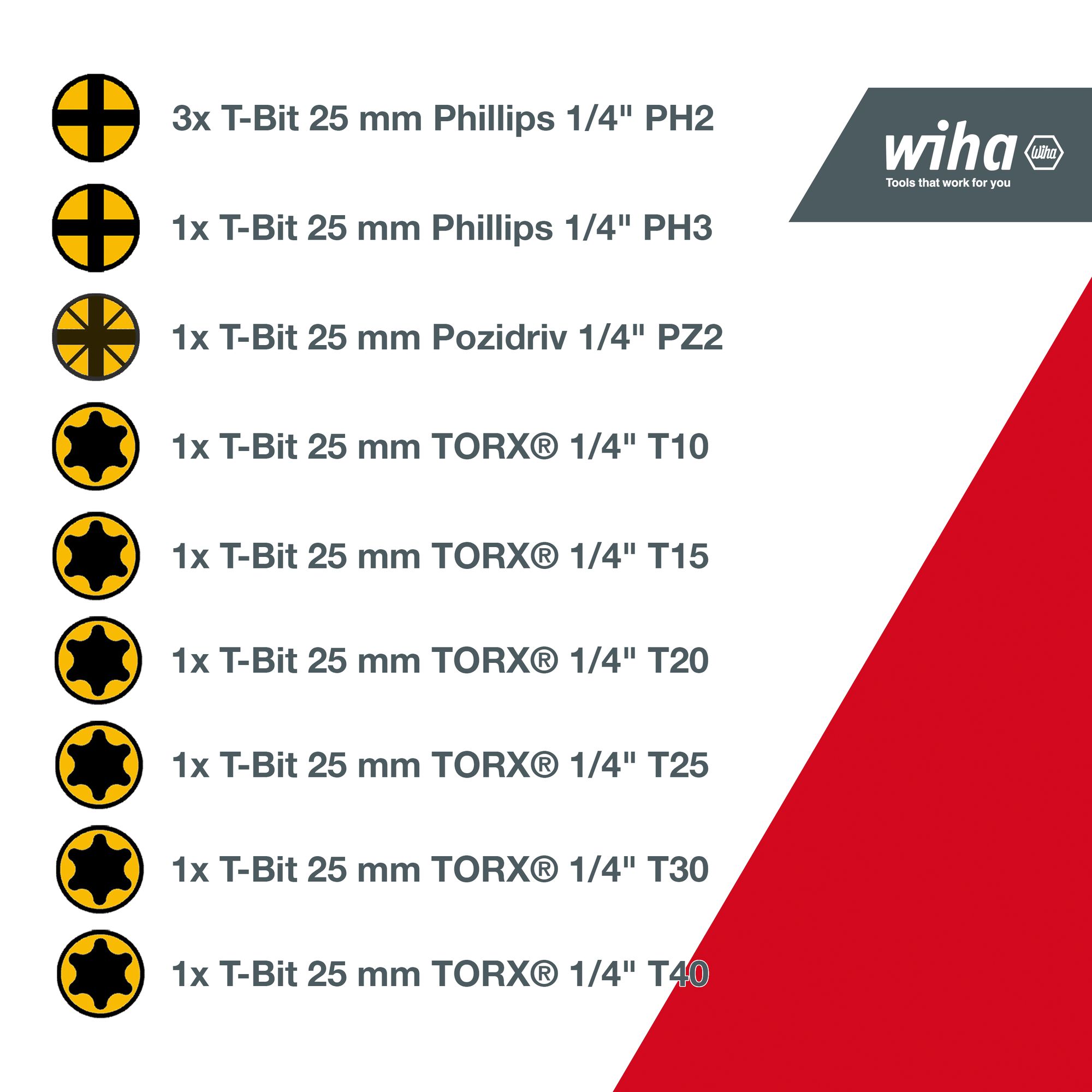 Produkteigenschaften:EFFIZIENZ: Der Spezialist mit 120x höhrerer Lebensdauer* durch optimierten Bit für Schrauben in T-Form. (*im Vergleich zu Wiha Standardbit)SENKT IHRE KOSTEN: Bit dank blauer Farbmakierung schnell und einfach auffindbar - mit UV Licht sogar in dunkler UmgebungZEITSPAREND: Kein langes Suchen dank leuchtend farbigem Bit, geringe Bitwechselzeit dank hoher Lebensdauer. Automatische nung auf Knopfdruck und einfacher Bitwechsel direkt im HalterUNIVERSELL: Dank der patentierten, verlängerten Torsionszone ist der Bit auch für Impact- und Schlagschrauber geeignetIDEAL: Für das Verschrauben von T-förmigen Schrauben mit einem Winkel ungleich 90° zwischen Gewinde und SchraubenkopfBisher herrschte beim Bitkauf keine Klarheit, welche Bits für welche Anwendung passend sind. Wiha macht Schluss mit der Komplexität zwischen der verwendeten Maschine, dem Schraubfall und der großen Auswahl an unterschiedlichen Bits. Dank des revolutionären Bitkonzepts von Wiha ist lediglich die Schraubenform ausschlaggebend für die Auswahl des richtigen Bit.So eignet sich der T-Bit ideal für das Verschrauben von T-förmigen Schrauben mit 90° Winkel zwischen Gewinde und Schraubenkopf. Dank der patentierten, verlängerten Torsionszone ist der Bit auch für Impact- und Schlagschrauber geeignet und hat eine 120x höhere Lebensdauer im Vergleich zu den Wiha Standardbits. Zudem sind die farbigen Bits schnell und einfach auffindbar und dank des Farbmantels auch im Dunkeln mit UV-Licht gut zu finden. Somit kann die Anzahl verloren gegangener Bits gesenkt und die Kosten der Neubeschaffung eingespart werden. Die Bits inklusive Bithalter sind rsichtlich und kompakt im FlipSelector verstaut, welcher eine einfache und schnelle Bitentnahme ermöglicht.Anwendung: Für das Verschrauben von Schrauben in T-Form geeignet. Auch für Impact- und Schlagschrauber geeignet.1x T-Bit 25 mm Phillips 1/4" PH1Technische Daten:Werkzeug für Elektrik: NeinSB - Verpackung: JaESD Artikel: Neinmit Batterie / Akku: NeinLieferumfang:Wiha Bit Set FlipSelector T-Bit 25 mm Phillips, Pozidriv, TORX® 13-tlg. 1/4" C6,3 (41824):1x T-Bit 25 mm Phillips 1/4" PH13x T-Bit 25 mm Phillips 1/4" PH21x T-Bit 25 mm Phillips 1/4" PH31x T-Bit 25 mm Pozidriv 1/4" PZ21x T-Bit 25 mm TORX® 1/4" T101x T-Bit 25 mm TORX® 1/4" T151x T-Bit 25 mm TORX® 1/4" T201x T-Bit 25 mm TORX® 1/4" T251x T-Bit 25 mm TORX® 1/4" T301x T-Bit 25 mm TORX® 1/4" T401x Bithalter magnetisch 60 mm 1/4" extra starker Magnet in Box (41922)1x FlipSelector