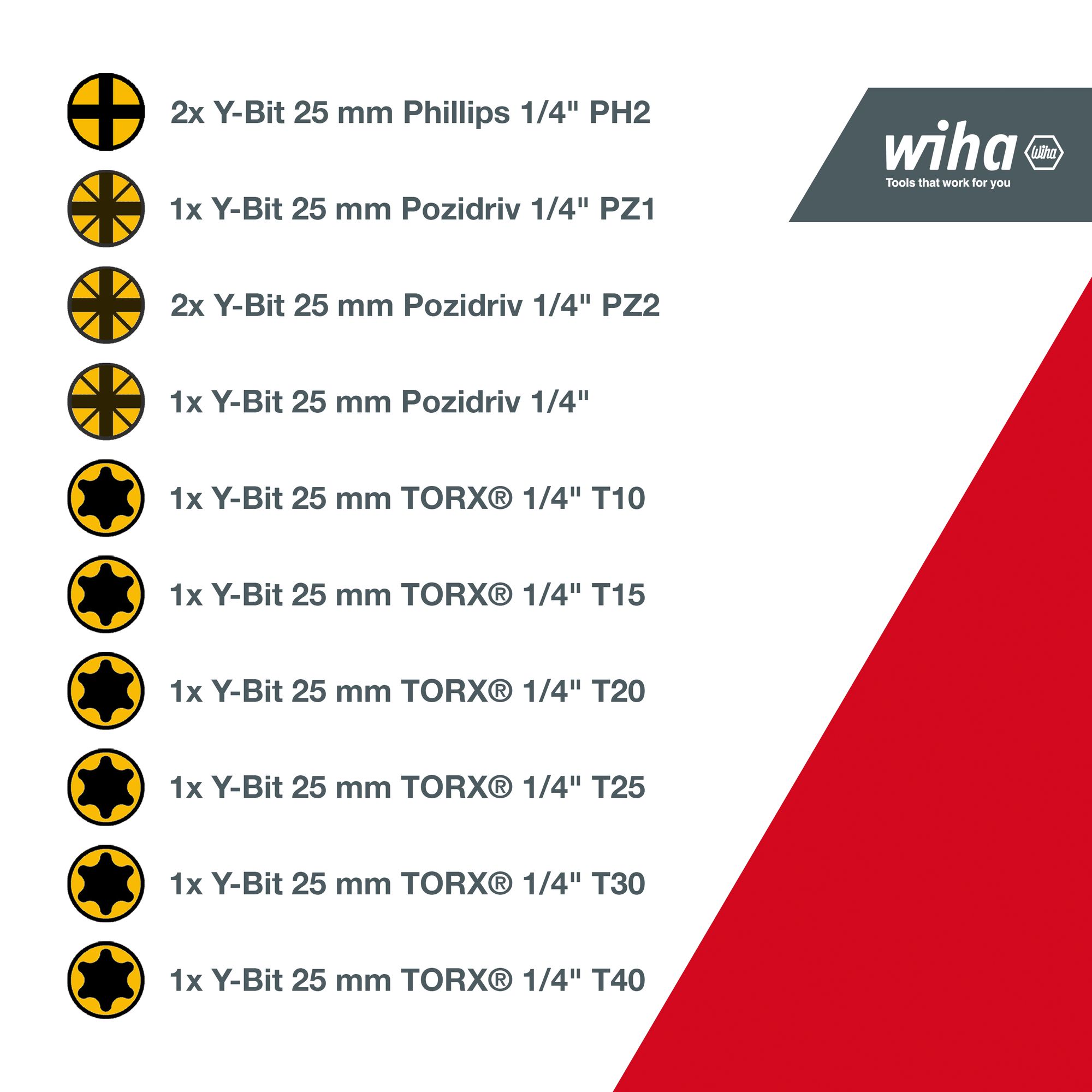 Produkteigenschaften:EFFIZIENZ: Der Spezialist mit 120x höhrerer Lebensdauer* durch optimierten Bit für Schrauben in Y-Form. (*im Vergleich zu Wiha Standardbit)SENKT IHRE KOSTEN: Bit dank gelber Farbmakierung schnell und einfach auffindbar - mit UV Licht sogar in dunkler UmgebungZEITSPAREND: Kein langes Suchen dank leuchtend farbigem Bit, geringe Bitwechselzeit dank hoher Lebensdauer. Automatische nung auf Knopfdruck und einfacher Bitwechsel direkt im HalterUNIVERSELL: Dank der patentierten, verlängerten Torsionszone ist der Bit auch für Impact- und Schlagschrauber geeignetIDEAL: Für das Verschrauben von Y-förmigen Schrauben mit einem Winkel ungleich 90° zwischen Gewinde und SchraubenkopfProduktbeschreibungBisher herrschte beim Bitkauf keine Klarheit, welche Bits für welche Anwendung passend sind. Wiha macht Schluss mit der Komplexität zwischen der verwendeten Maschine, dem Schraubfall und der großen Auswahl an unterschiedlichen Bits. Dank des revolutionären Bitkonzepts von Wiha ist lediglich die Schraubenform ausschlaggebend für die Auswahl des richtigen Bit.So eignet sich der Y-Bit ideal für das Verschrauben von Y-förmigen Schrauben mit einem Winkel ungleich 90° zwischen Gewinde und Schraubenkopf. Dank der patentierten, verlängerten Torsionszone ist der Bit auch für Impact- und Schlagschrauber geeignet und hat eine 120x höhere Lebensdauer im Vergleich zu den Wiha Standardbits. Zudem sind die farbigen Bits schnell und einfach auffindbar und dank des Farbmantels auch im Dunkeln mit UV-Licht gut zu finden. Somit kann die Anzahl verloren gegangener Bits gesenkt und die Kosten der Neubeschaffung eingespart werden. Die Bits inklusive Bithalter sind rsichtlich und kompakt im FlipSelector verstaut, welcher eine einfache und schnelle Bitentnahme ermöglicht.Für das Verschrauben von Schrauben in Y-Form geeignet. Auch für Impact- und Schlagschrauber geeignet.Technische Daten:Werkzeug für Elektrik: NeinSB - Verpackung: JaESD Artikel: Neinmit Batterie / Akku: NeinLieferumfang:Wiha Bit Set FlipSelector Y-Bit 25 mm Phillips, Pozidriv, TORX® 13-tlg. 1/4" C6,3 (41827):2x Y-Bit 25 mm Phillips 1/4" PH21x Y-Bit 25 mm Pozidriv 1/4" PZ12x Y-Bit 25 mm Pozidriv 1/4" PZ21x Y-Bit 25 mm Pozidriv 1/4" PZ31x Y-Bit 25 mm TORX® 1/4" T101x Y-Bit 25 mm TORX® 1/4" T151x Y-Bit 25 mm TORX® 1/4" T201x Y-Bit 25 mm TORX® 1/4" T251x Y-Bit 25 mm TORX® 1/4" T301x Y-Bit 25 mm TORX® 1/4" T401x Bithalter magnetisch 60 mm 1/4" extra starker Magnet in Box (41922)1x FlipSelector