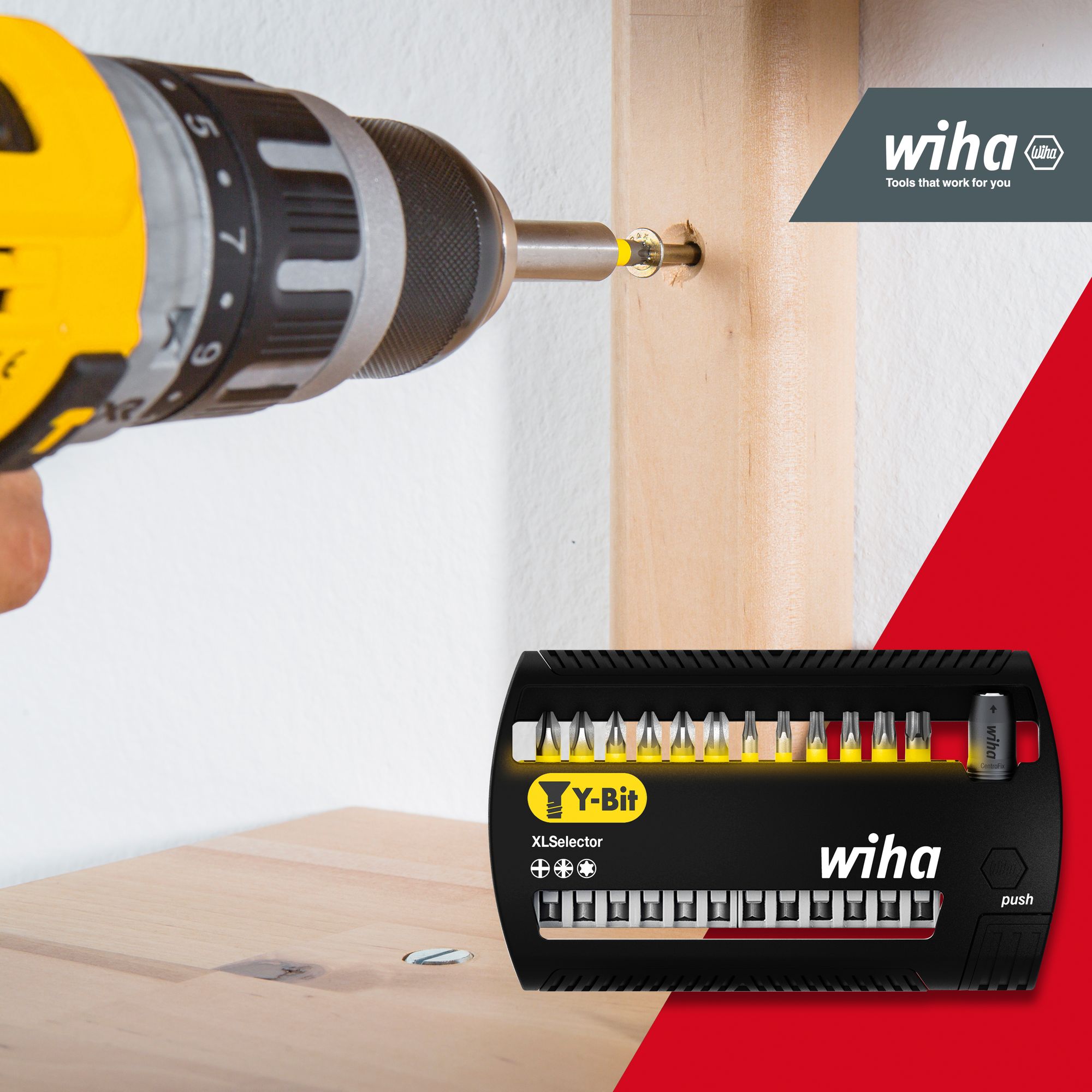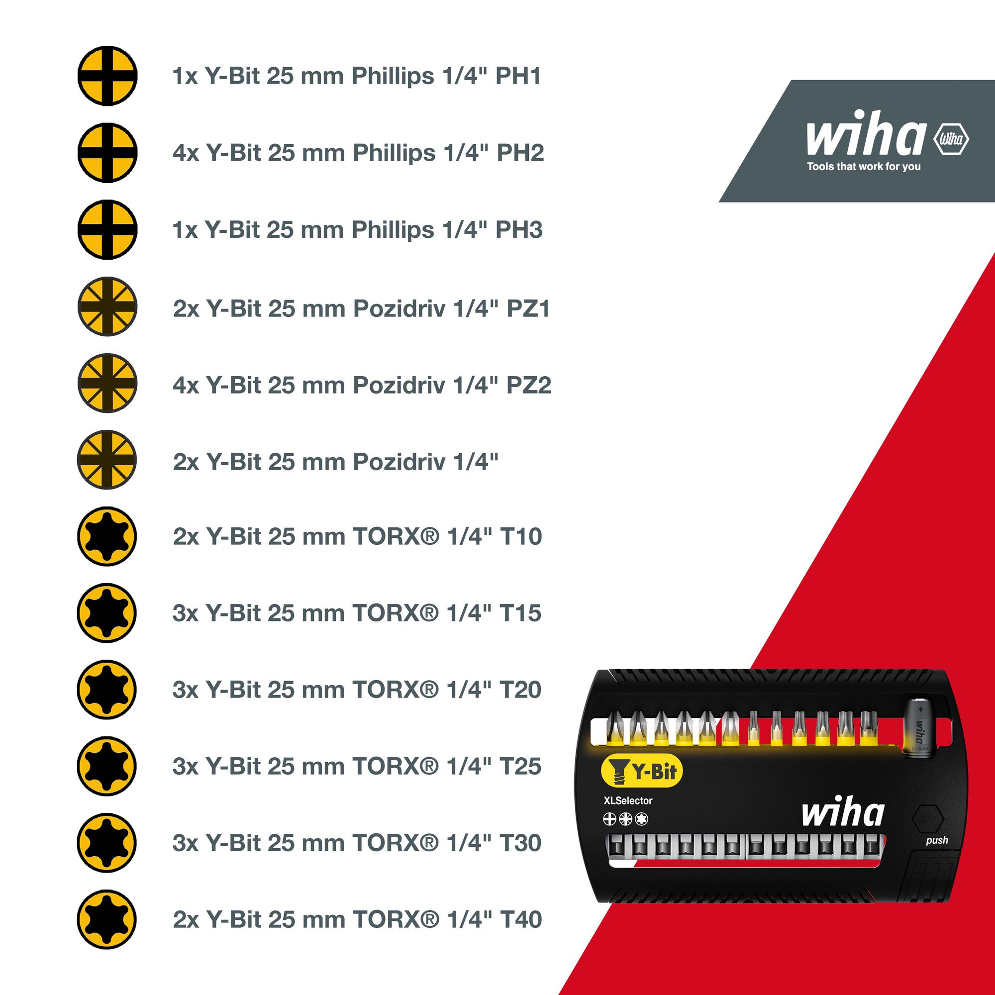 Produkteigenschaften:Bisher herrschte beim Bitkauf keine Klarheit, welche Bits für welche Anwendung passend sind. Wiha macht Schluss mit der Komplexität zwischen der verwendeten Maschine, dem Schraubfall und der großen Auswahl an unterschiedlichen Bits. Dank des revolutionären Bitkonzepts von Wiha ist lediglich die Schraubenform ausschlaggebend für die Auswahl des richtigen Bit.So eignet sich der Y-Bit ideal für das Verschrauben von Y-förmigen Schrauben mit einem Winkel ungleich 90° zwischen Gewinde und Schraubenkopf. Dank der patentierten, verlängerten Torsionszone ist der Bit auch für Impact- und Schlagschrauber geeignet und garantiert eine 120x höhere Lebensdauer im Vergleich zu den Wiha Standardbits. Zudem sind die farbigen Bits schnell und einfach auffindbar und dank des Farbmantels auch im Dunkeln mit UV-Licht gut zu finden. Somit kann die Anzahl verloren gegangener Bits gesenkt und die Kosten der Neubeschaffung eingespart werden. Die Bits sind in den gängigsten Abtrieben kompakt und platzsparend im XLSelector verstaut.Anwendung: Für das Verschrauben von Schrauben in Y-Form geeignet. Auch für Impact- und Schlagschrauber geeignet.EFFIZIENZ: Der Spezialist mit 120x höhrerer Lebensdauer* durch optimierten Bit für Schrauben in Y-Form. (*im Vergleich zu Wiha Standardbit)SENKT IHRE KOSTEN: Bit dank gelber Farbmakierung schnell und einfach auffindbar - mit UV Licht sogar in dunkler UmgebungZEITSPAREND: Kein langes Suchen dank leuchtend farbigem Bit, geringe Bitwechselzeit dank hoher LebensdauerUNIVERSELL: Dank der patentierten, verlängerten Torsionszone ist der Bit auch für Impact- und Schlagschrauber geeignetIDEAL: Für das Verschrauben von Y-förmigen Schrauben mit einem Winkel ungleich 90° zwischen Gewinde und SchraubenkopfTechnische Daten:Werkzeug für Elektrik: NeinSB - Verpackung: JaESD Artikel: Neinmit Batterie / Akku: NeinLieferumfang:Wiha Bit Set XLSelector Y-Bit 50 mm Phillips, Pozidriv, TORX® 13-tlg. 1/4" E6,3 (41834):2x Y-Bit 50 mm Pozidriv 1/4" PH21x Y-Bit 50 mm Pozidriv 1/4" PZ12x Y-Bit 50 mm Pozidriv 1/4" PZ21x Y-Bit 50 mm Pozidriv 1/4" PZ31x Y-Bit 50 mm TORX® 1/4" T101x Y-Bit 50 mm TORX® 1/4" T151x Y-Bit 50 mm TORX® 1/4" T201x Y-Bit 50 mm TORX® 1/4" T251x Y-Bit 50 mm TORX® 1/4" T301x Y-Bit 50 mm TORX® 1/4" T401x Bithalter magnetisch 58 mm 1/4" (01895)1x XLSelector