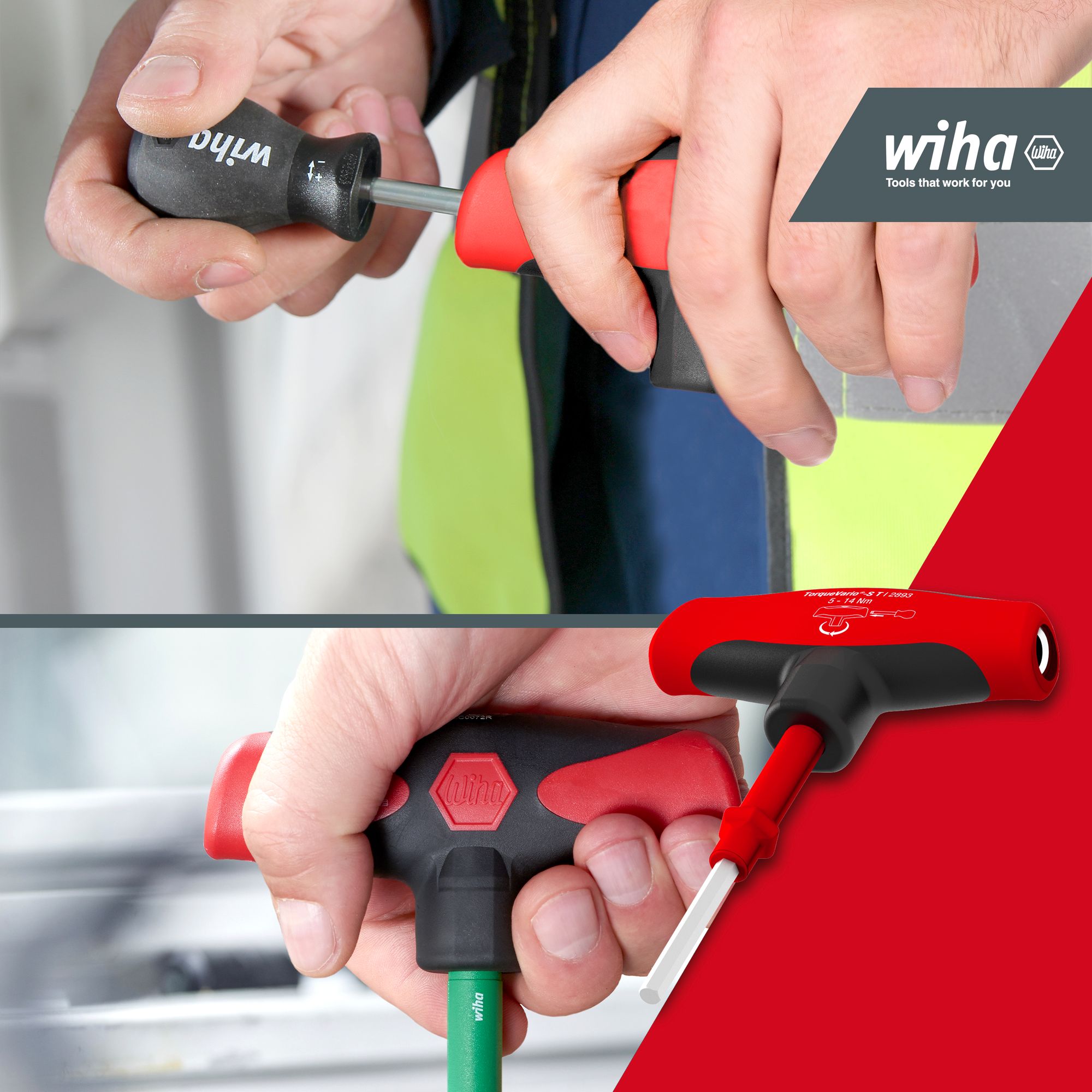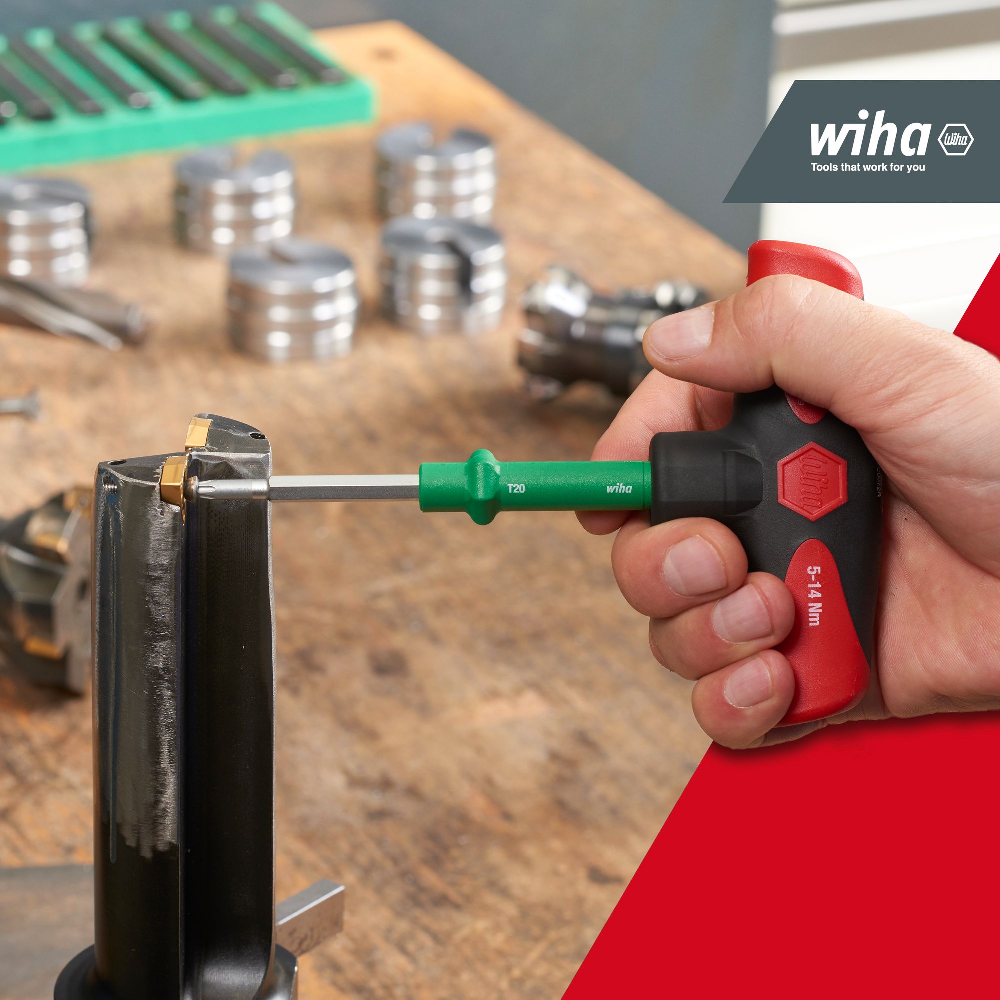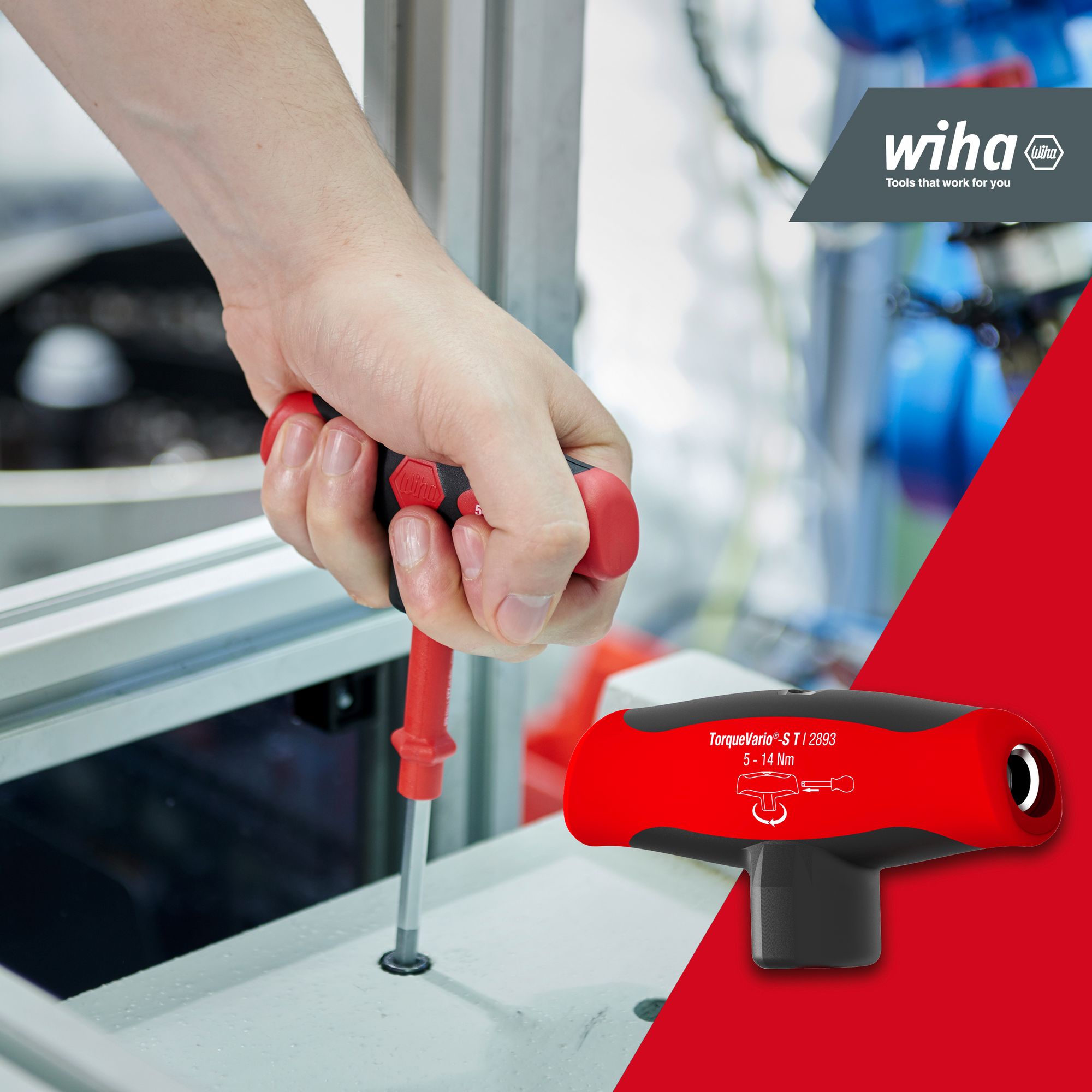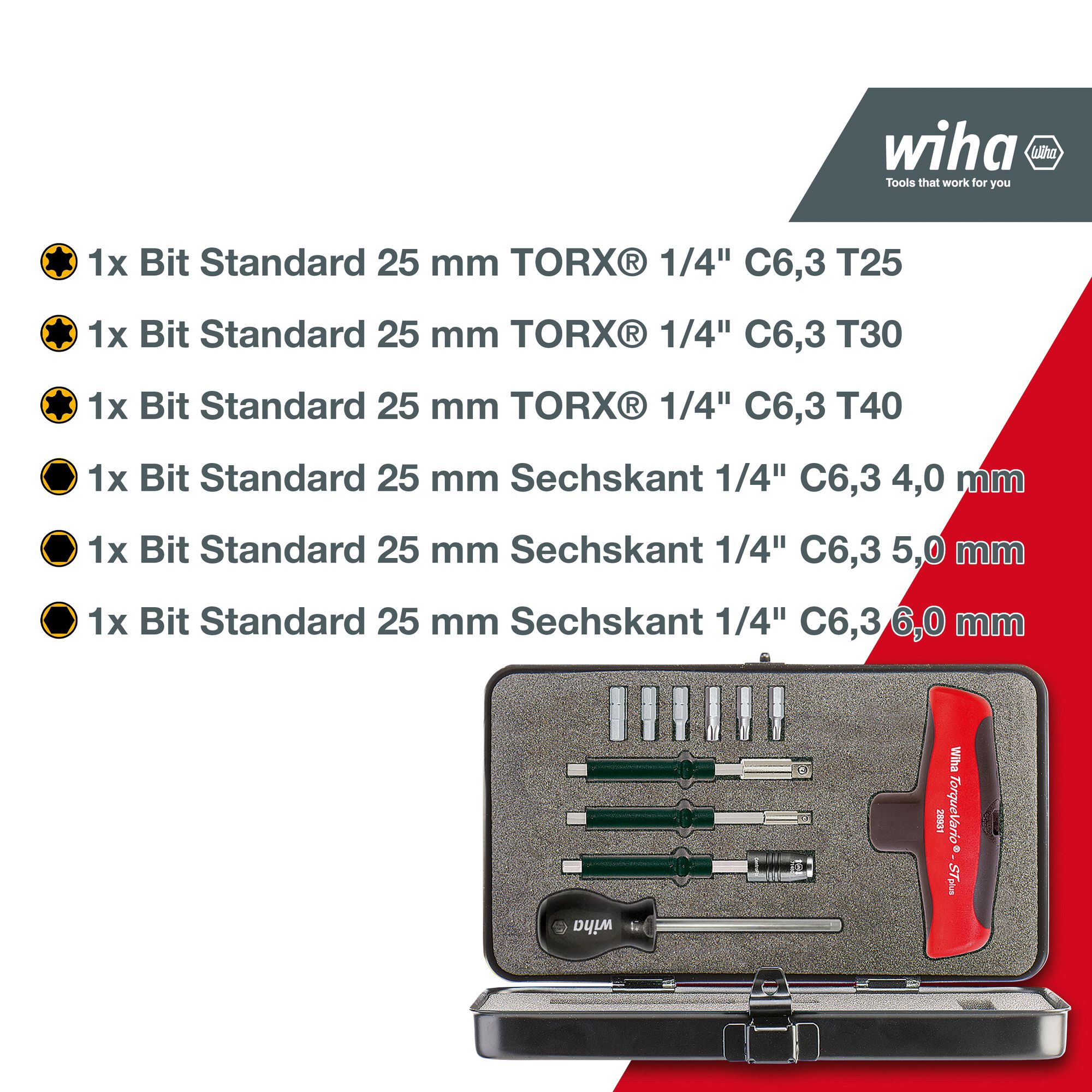 Produkteigenschaften:Das Zudrehen von Schrauben mit einem definierten Drehmomentwert r 5 Nm erfordert mit einem normalen Drehmomentschraubendreher einen hohen Kraftaufwand. Deutlich einfacher geht es mit dem Drehmoment-Schraubendreher mit Quergriff TorqueVario®-S Tplus. Mithilfe der integrierten numerischen Skala und des beiliegenden Einstellwerkzeugs kann der Drehmomentbereich variabel eingestellt und somit ein großes Anwendungsgebiet abgedeckt werden. Ein deutlich hör- und fühlbares Signal beim Auslösen des Drehmoments gewährleistet prozesssicheres Arbeiten und schützt vor Materialbeschädigungen und Nacharbeit. Die integrierte Rutschkupplung verhindert, dass der gewünschte Drehmomentwert rschritten wird. Mit einer Auslösegenauigkeit von +/- 6% erfüllt das Drehmomentwerkzeug die Anforderungen der DIN EN ISO 6789. Der komfortable Quergriff mit Weichzonen bietet eine optimale Drehmomentrtragung.DURCHDACHT: Das variabel einstellbare Drehmoment deckt einen großen Anwendungsbereich abPRAKTISCH: Das Drehmoment-Schraubendreher Set sicher und geordnet in einer robusten und rsichtlichen Box untergebrachtSCHUTZ: Das richtige Drehmoment schützt Sie vor Materialbeschädigungen und NacharbeitHANDHABUNG: Müheloses und komfortables rtragen hoher Drehmomente dank Drehmomentschraubendreher mit Griff (Quergriff)ANWENDUNG: Zum kontrollierten Verschrauben bei vorgegebenem Drehmoment. Ideal für die rtragung hoher DrehmomenteTechnische Daten:Werkzeug für Elektrik: NeinSB - Verpackung: NeinESD Artikel: Neinmit Batterie / Akku: NeinLieferumfang:Wiha Drehmoment-Schraubendreher mit Quergriff Set TorqueVario®-S 5-14 Nm gemischt 12-tlg. variabel einstellbare Drehmomentbegrenzung inkl. Box (29234):1x Drehmoment-Schraubendreher mit Quergriff TorqueVario®-S T 5-14 Nm variabel einstellbare Drehmomentbegrenzung 5 - 14 (29233)1x Einstellwerkzeug für Drehmoment-Schraubendreher mit Quergriff 90 mm (28691)1x Adapterklinge für Drehmoment-Schraubendreher mit Quergriff 1/4" x 120 mm (28756)1x Adapterklinge für Drehmoment-Schraubendreher mit Quergriff 3/8" x 120 mm (28757)1x Bithalter für Drehmoment-Schraubendreher mit Quergriff 125 mm (28758)1x Bit Standard 25 mm TORX® 1/4" C6,3 T25 (01719)1x Bit Standard 25 mm TORX® 1/4" C6,3 T30 (01721)1x Bit Standard 25 mm TORX® 1/4" C6,3 T40 (01722)1x Bit Standard 25 mm Sechskant 1/4" C6,3 4,0 mm (01706)1x Bit Standard 25 mm Sechskant 1/4" C6,3 5,0 mm (01707)1x Bit Standard 25 mm Sechskant 1/4" C6,3 6,0 mm (01708)1x Box