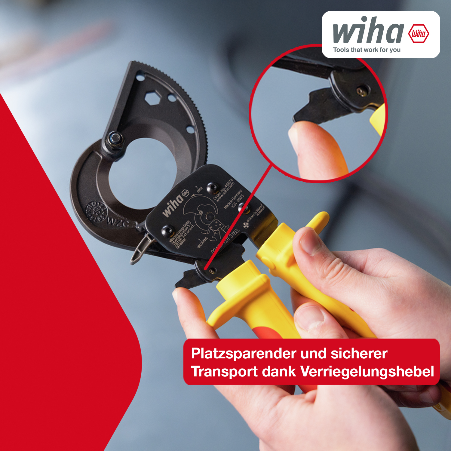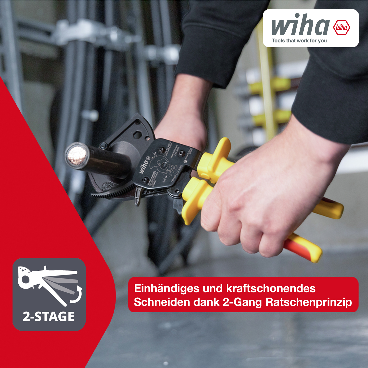 ProdukteigenschaftenQUETSCHFREIES SCHNEIDEN: Der Ratschen-Kabelschneider ermöglicht saubere Schnitte ohne Quetschungen, ideal für Kupfer- und Aluminiumkabel bis 300 mm². Perfekt für ElektrikerEINHÄNDIGES SCHNEIDEN: Dank Ratschenprinzip ist das Elektriker Werkzeug kraftsparend und einfach mit nur einer Hand zu bedienen, auch bei dicken KabelnNOTENTRIEGELUNG: Der Ratschenschneider ermöglicht dem Elektriker einen manuellen Abbruch für maximale Kontrolle und mehr Sicherheit beim ArbeitenKOMPAKTE BAUWEISE: Der Ratschen-Kabelschneider besitzt einen Verriegelungshebel für einfachen Transport und platzsparende AufbewahrungERGONOMISCH UND SICHER: Die ergonomischen Griffe der Kabelschere ermöglichen bequemes Schneiden von Kupfer und Aluminiumkabeln, zusätzlich ist das Werkzeug VDE geprüft und bis 1.000V zugelassenEinen sauberen Schnitt beim Ablängen von Kabel mit großem Durchmesser erzielen? Das ermöglicht der Ratschenkabelschneider für Kupfer- oder Aluminiumkabel mit einem Durchmesser von bis zu 32 mm (300 mm²). Der Kabelschneider ermöglicht dabei absolut sauberes, glattes und quetschfreies Schneiden während die Ratschenfunktion den benötigten Krafteinsatz reduziert und somit für ermüdungsfreies Arbeiten sorgt. Darüber hinaus sorgt der Kabelschneider mit Ratschenprinzip für eine einfache und komfortabel Einhandbedienung, die zusätzlich durch die ergonomischen und rutschfesten Soft-Handgriffe mit Abgleitschutz unterstützt wird. Dank der Notentriegelungsfunktion kann der Schneidvorgang jederzeit manuell abgebrochen werden. Für einen sicheren und platzsparenden Transport dient der Verriegelungshebel am Zangenkopf. Der isolierte Ratschenschneider wird gemäß der internationalen Norm IEC 60900 einer Stückprüfung unterzogen und ermöglichen ein sicheres Arbeiten im Bereich von spannungsführenden Teilen bis 1.000 V AC.Technische Daten:Durchmesser Ø 34 mmGesamtlänge 275 mm / 10"Querschnittsfläche max. 300 mm²Gewicht 705 gLieferumfang:1x Wiha Kabelschneider electric bis 300 mm² mit Ratschenprinzip 275 mm, 10" (46674)
