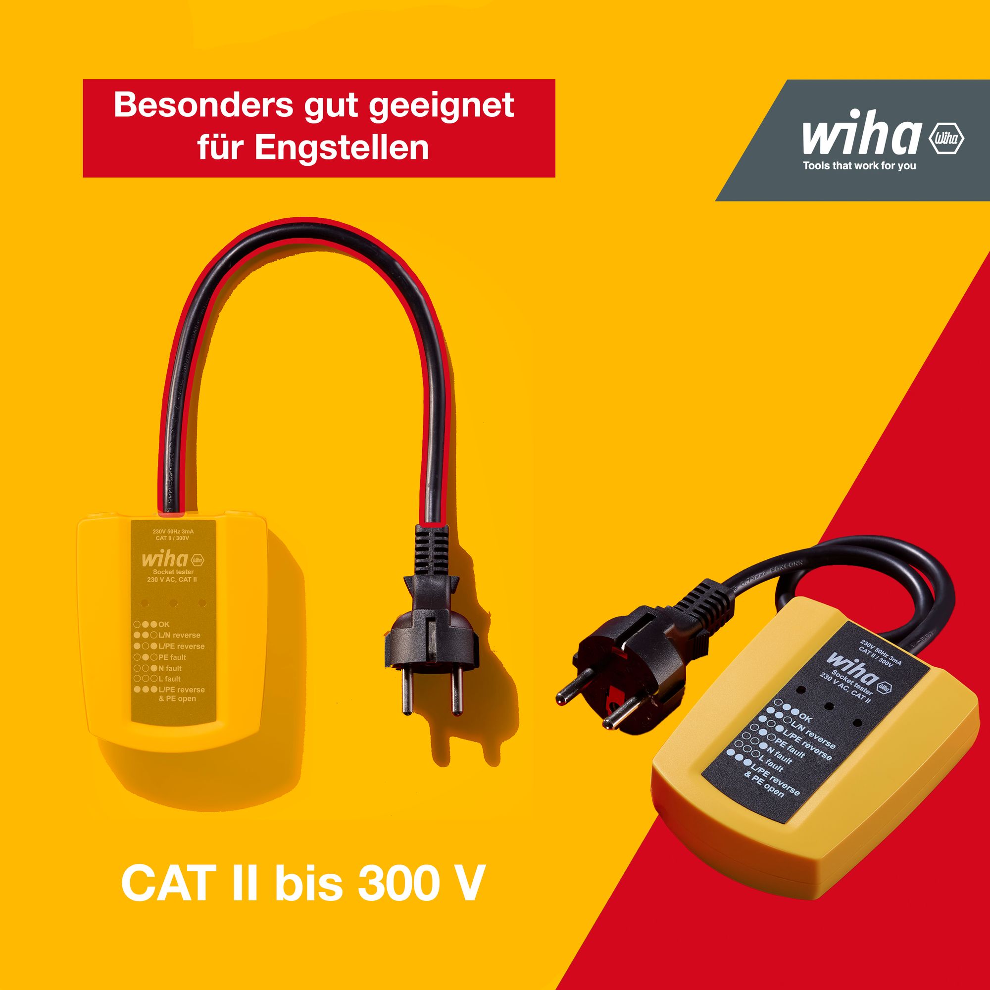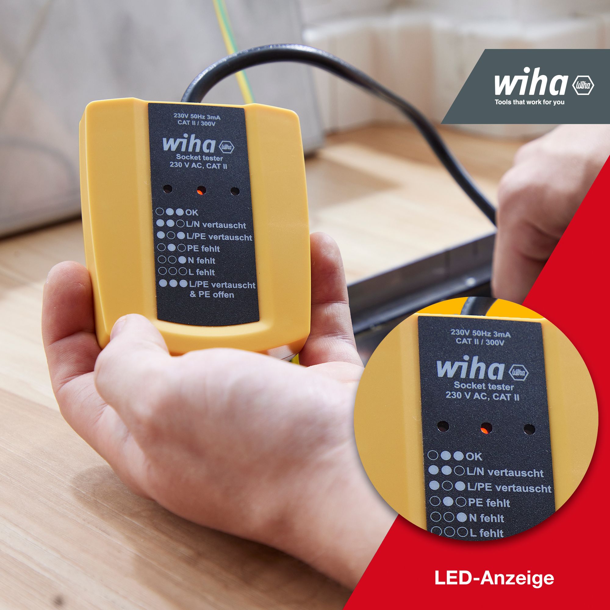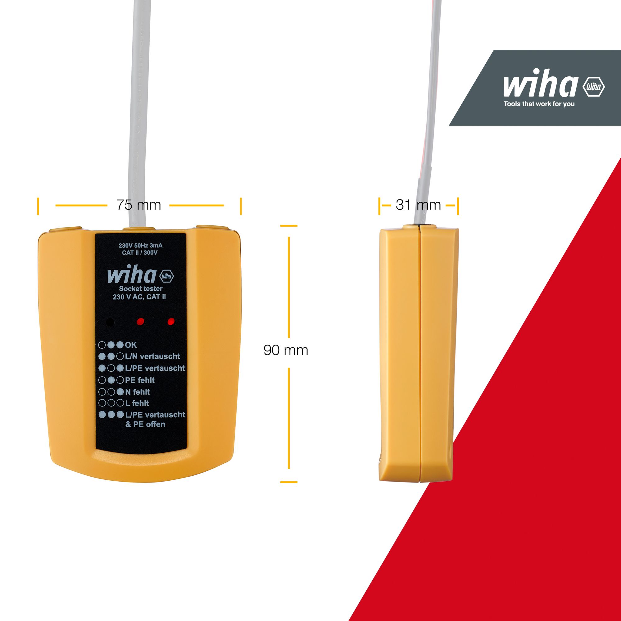 Produkteigenschaften:FLEXIBILITÄT: Schuko-Stecker mit flexiblem Kabel erleichtert den Zugang zu schwer zugänglichen StellenLED-ANZEIGE: Der Steckdosenprr vereinfacht Ihre Arbeit durch die Fehlerbestimmung mittels LED-AnzeigeMAßE: 9,0 x 7,5 cmMULTIFUNKTIONAL: Für die rprüfung und Fehlererkennung von Schuko-Steckdosen, Kabeltrommeln und VerlängerungskabelMESSKATEGORIE: CAT II bis 300 VWurde die Steckdose korrekt angeschlossen? Der Steckdosentester von Wiha ermöglicht eine einfache Prüfung von Schuko-Steckdosen auf korrekte Verdrahtung. Fehler werden durch eine LED-Anzeige eindeutig signalisiert und der Fehlerursache zugeordnet. Dank eines flexiblen Kabels am Schuko-Stecker ist der Steckdosentester von Wiha auch in beengten Arbeitssituationen einsetzbar und ermöglicht zu jeder Zeit ein einfaches Ablesen der Messergebnisse. Gemäß der Messkatergorie CAT II bis 300 V bietet der Steckdosentester von Wiha maximale Sicherheit bei Arbeiten an Stromkreisen.EN 61010-1 (DIN VDE 0411-1). IP 40. CE-zertifiziert.Technische Daten:SB - Verpackung: NeinBreite (mm): 75 mmHöhe (mm): 31 mmGesamtlänge (mm): 93 mmNennspannung (Volt): 230 VFrequenz (MHz): 50 MHzMesskategorie: CAT II 300VÜberspannungsschutz (V): 300VMax. tolerierte Spannung (V): 5 VSchutzart IP: IP40Betriebstemperatur min (°C): -10 °CBetriebstemperatur max (°C): 50 °CBetriebstemperatur min - max (°C): -10 - 50°CLagertemperatur min (°C): -10 °CLagertemperatur max (°C): 50 °CLagertemperatur min - max (°C): -10 - 50Verschmutzungsgrad: 2mit Batterie / Akku: NeinLieferumfang:1x Wiha Steckdosentester 230 V AC, CAT II (45220)