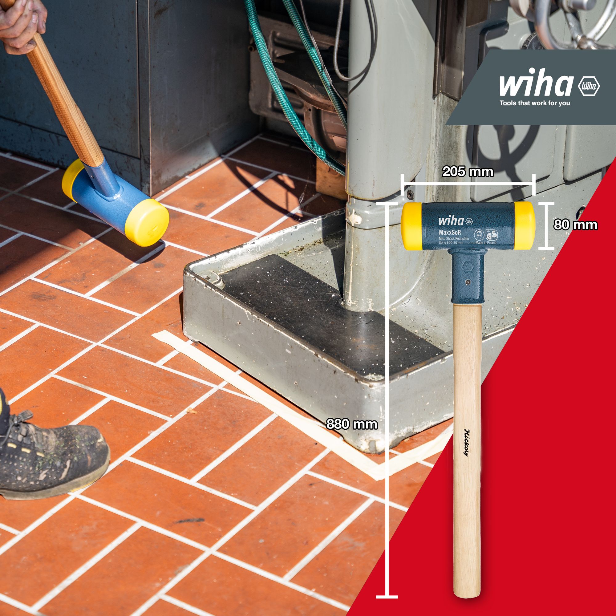 Produkteigenschaften:Mit seinem mittelharten, gelben Kopf ist der Wiha Schonhammer ideal für eine Vielzahl von Arbeiten - vom Werkzeug- und Maschinenbau r Kfz-Reparaturen bis hin zu Blech- und MontagearbeitenDas einzigartige Design dieses Hammers ermöglicht dosierte Positionsschläge, was eine präzise Handhabung Ihrer Werkstücke gewährleistet.Der ergonomische Hickory-Holzstiel liegt gut in der Hand und ermöglicht ein komfortables Arbeiten für längere Zeiträume hinweg. Darüber hinaus minimiert das rückschlagfreie Hämmern die Belastung von Gelenken, Sehnen und Muskeln, wodurch Ihre Gesundheit geschützt wird.Ein weiterer Vorteil des Schonhammers ist die Kosteneffizienz. Sowohl der Stiel als auch die Schlagköpfe sind als Ersatzteile erhältlich, wodurch die Lebensdauer des Hammers verlängert und Ihre Kosten gesenkt werden.Zusammengefasst ist der Wiha Schonhammer ein vielseitiges, zuverlässiges und langlebiges Werkzeug, das in keiner Werkstatt fehlen sollte. Es bietet die perfekte Balance zwischen Leistung und Komfort und ist damit ein wertvoller Beitrag für Ihre Werkzeugsammlung.VIELSEITIGE ANWENDUNG: Gelber Kopf / mittelhart: Der Gummihammer groß ist z.B. für Werkzeug- und Maschinenbau, Kfz-Reparatur, Blech- und MontagearbeitenEFFIZIENT: Der Schonhammer mit Rund-Schlagkopf ermöglicht eine optimale Schlagwirkung bei vermindertem Kraftaufwand, wodurch die Arbeit erleichtert wirdGESUNDHEIT: Der Hammer minimiert die Belastung auf Gelenke, Sehnen und Muskulatur, wodurch Ihre Gesundheit geschont wirdKOSTEN: Der ergonomische Hickory-Holzstiel und die Schlagköpfe sind jeweils als Ersatzteile erhältlichQUALITÄT: Schonhammer mit 880 mm Länge und 80 mm Schlagkopf-Durchmesser - handlich und zuverlässig für jede Werkstatt.Der Wiha Schonhammer mit Hickory-Holzstiel und einem Rund-Schlagkopf-Durchmesser von 80 mm ist ein unverzichtbares Werkzeug für jeden Profi und Heimwerker. Dieser rückschlagfreie Kunststoffhammer mit einer Gesamtlänge von 880 mm bietet maximale Effizienz und Sicherheit bei jeder Anwendung.Technische Daten:Werkzeug für Elektrik: NeinSB - Verpackung: NeinESD Artikel: NeinDurchmesser Schlagkopf (mm): 100Gesamtlänge (mm): 1000 mmHöhe Hammerkopf (mm): 210 mmmit Batterie / Akku: NeinLieferumfang:1x Vorschlaghammer rückschlagfrei, mittelhart mit Hickory-Holzstiel, Rund-Schlagkopf 80, 880 mm (02101)