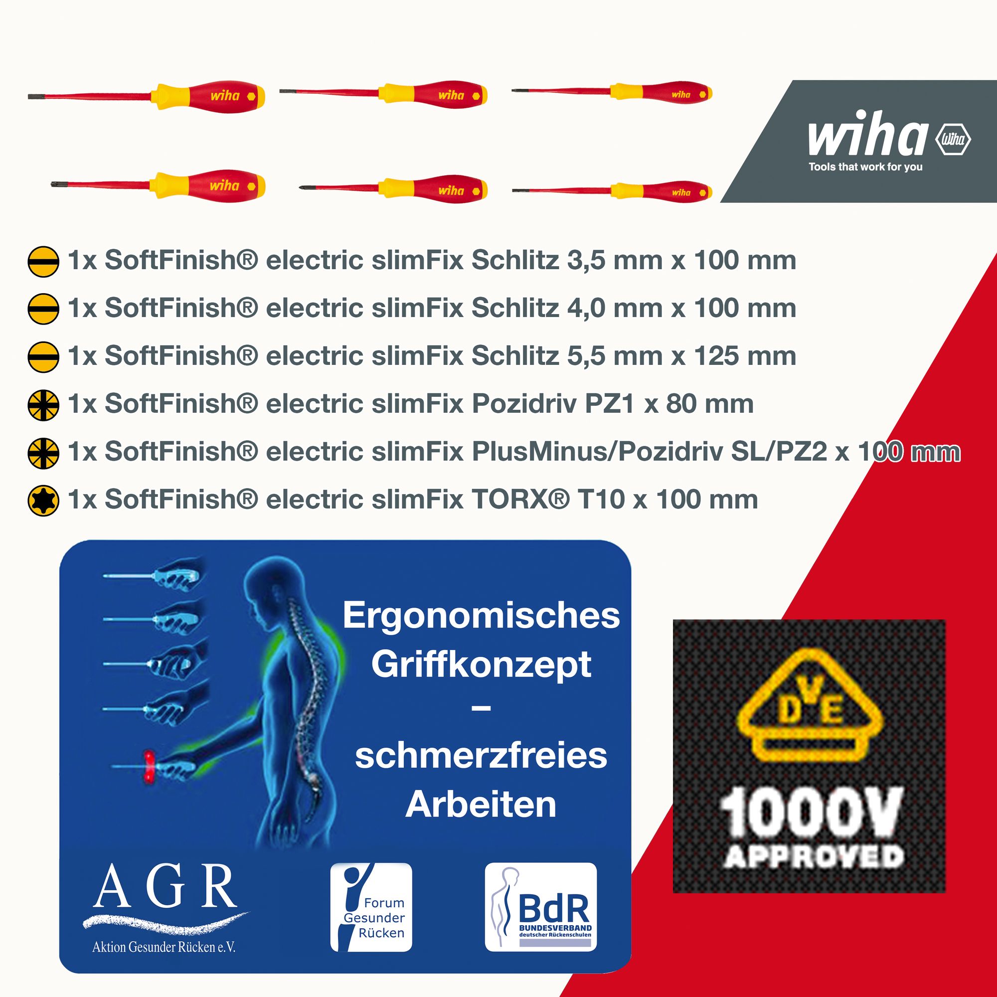 Produkteigenschaften:Das passende Werkzeug zur Anwendung nicht griffbereit zu haben, bedeutet vor allem im mobilen Einsatz rflüssigen Zeitaufwand Mit dem 18-tlg. Werkzeug Set für Elektriker sind dank praktischer Gürteltasche stets sämtliche Utensilien für Anwendungen im Elektrikerbereich mit nur einem Handgriff einsatzbereitDabei hat der Anwender während des Arbeitseinsatzes dauerhaft beide Hände frei zum ArbeitenInhaltlich bietet das Werkzeug Set Elektriker eine weite Bandbreite an essentiellen, praktischen Handwerkzeugen für den ElektrikerUnter anderem enthält das Set die präzisen PicoFinish® electric Feinschraubendreher, die SoftFinish® electric slim Fix Schraubendreher, die Wiha Taschenlampe und die Installationszange TriCut. Darr hinaus bietet die praktische Gürteltasche Stauraum für weitere Utensilien und kann schnell und einfach am Gürtel befestigt werden.Maße: 28 × 25 × 8 cmDURCHDACHT: Freie Hände und keine Beschädigung der Arbeitshose durch Werkzeugtasche, die am Gürtel befestigt werden kannSCHUTZ: Zum Schutz des Elektrikers / Anwenders ist jedes Werkzeug einzeln bei 10.000 V AC getestet und zugelassen für 1.000 V ACSICHERHEIT: Wiha Slim Klingen gewährleisten dank ihrer 33% schlankeren Bauart einen geschützten Zugang zu tief liegenden Schrauben. Kein eigenständiges Abisolieren der Klinge mehr nötigGESUNDHEIT: Ergonomisches Arbeiten möglich durch das patentiertem Griffdesign für hand- und muskelschonendes Arbeiten. Von Ärzten und Therapeuten der „Aktion Gesunder Rücken“ (AGR) empfohlenEFFIZIENZ: Alle Werkzeuge sind in der Elektrikertasche schnell verfügbar und immer mit dabeiTechnische Daten:Werkzeug für Elektrik: JaSB - Verpackung: NeinESD Artikel: NeinBreite (mm): 260 mmmit Batterie / Akku: NeinLieferumfang:Wiha Werkzeug Set Elektriker gemischt, 18-tlg. inkl. Gürteltasche (44574):1x Schraubendreher SoftFinish® electric slimFix Schlitz 3,5 mm x 100 mm (35446)1x Schraubendreher SoftFinish® electric slimFix Schlitz 4,0 mm x 100 mm (35390)1x Schraubendreher SoftFinish® electric slimFix Schlitz 5,5 mm x 125 mm (35391)1x Schraubendreher SoftFinish® electric slimFix Pozidriv PZ1 x 80 mm (35395)1x Schraubendreher SoftFinish® electric slimFix PlusMinus/Pozidriv SL/PZ2 x 100 mm (36330)1x Schraubendreher SoftFinish® electric slimFix TORX® T10 x 100 mm (36536)1x Feinschraubendreher PicoFinish® electric Schlitz 1,5 mm x 50 mm (42374)1x Feinschraubendreher PicoFinish® electric Schlitz 2,5 mm x 65 mm (42376)1x Feinschraubendreher PicoFinish® electric Phillips PH00 x 50 mm (42379)1x Feinschraubendreher PicoFinish® electric Phillips PH0 x 65 mm (42378)1x Flachrundzange Professional electric mit Schneide gerade Form 200 mm, 8" (26727)1x Installationszange TriCut Professional electric 170 mm, 7" (38552)1x Seitenschneider Professional electric mit DynamicJoint® 140 mm, 5 1/2" (43326)1x Elektriker Gliedermaßstab Longlife® 2 m metrisch, 10 Glieder 15 mm (42068)1x Taschenlampe mit LED, Laser und UV Licht inkl. 3x AAA-Batterien 100 - 310 lm (41286)1x Spannungsprr SoftFinish® einpolig, 110 - 250 Volt Schlitz transparent, mit Ansteckclip 3,0 mm (34745)1x Mand 5m mit Gürtelclip (33251)1x Werkzeug-Gürteltasche