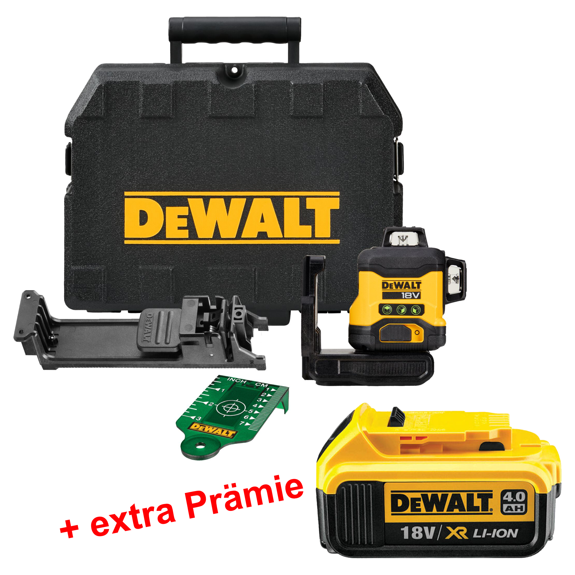 Lieferumfang: 1x DeWALT Akku-Multilinien-Laser DCLE34031N 1x Wandhalterung 1x Zieltafel 1x Transportkoffer Prämie: 1x DeWALT Akku 18V / 4,0 Ah DCB182-XJ