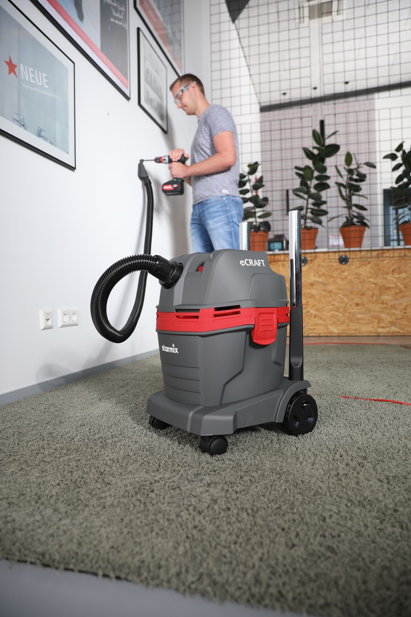 Produktbeschreibung:Weniger Unterbrechungen beim Arbeiten: Der starmix eCraft PL-1422 EWR hat eine halbautomatische Filterabreinigung: Durch mehrfaches Betätigen der Taste bei gleichzeitig verschlossenem Griffrohr werden die Filter kräftig mit Luft durchströmt und effektiv reinigt. Aufgrund seiner großzügigen Filterfläche von 3400 cm² und seiner Resistenz gegen Feuchtigkeit, reduziert der im Lieferumfang enthaltene Hauptfilter die Anzahl der notwendigen Filterwechsel deutlich.Intelligente Features: Der Nass- Trockensauger verfügt über eine starke Blasfunktion und kann aufgrund seiner kompakten Bauweise gut verstaut werden. Der Filterwechsel gestaltet sich einfach und Staub kann auch ohne Beutel gesaugt werden. Zudem können Sie das komplette Zubehör im Lieferumfang direkt hinten am Zubehördepot verstauen, den Saugschlauch per Gummizug am Gerät fixieren und haben oben auf der Ablagefläche genügend Platz, um kleine Werkzeuge aufzubewahren - die besten Voraussetzungen für eine saubere und organisierte Baustelle.Sehr hohe Saugleistung: Dank der kraftvollen Turbine erreicht der Allessauger eine Leistungsaufnahme von 1400 Watt, einen Volumenstrom von 71 l/s und einen Unterdruck von 255 mbar. Somit ist das Gerät optimal geeignet auch etwas grobere Partikel aufzusaugen. Die Lautstärke beträgt 72 dB(A). Der Sauger ist antistatisch vorbereitet, um unangenehme Stromstöße bei der Arbeit mit feinerem Staub zu vermeiden.Vielseitig einsetzbar: Aufgrund des ergonomischen Designs, des geringen Gewichts von 6,8 kg als auch der robusten Fahrtraverse mit großen Rädern und bremsbaren Lenkrollen lässt sich der Nass- Trockensauger komfortabel bewegen - auch auf unebenem Untergrund. Sollte zu viel Flüssigkeit aufgenommen werden, schaltet sich der Industriesauger automatisch und sicher ab, und schützt so Elektronik und Motor. Der starmix eCraft APL-1422 EWR ist deshalb bestens geeignet für den Einsatz im Büro, auf der Baustelle, für die Auto Innenraumreinigung, die Garage oder rund ums Haus.Technische Daten:Leistungsaufnahme: 1400 WattVolumenstrom: 71 l/sUnterdruck: 255 mbarBehältervolumen: 22 LiterSchalldruckpegel: 72 dB(A)Netzleitungslänge: 6 MeterAktionsradius: 8,5 - 9,5 MeterLieferumfang:1x Starmix Nass-Trockensauger eCraft PL-1422 EWR1x Saugschlauch 2,5 m1x ergonomisches Griffrohr2x Saugrohr (je 50,5 cm) aus Stahl verchromt1x Bodendüse mit Borsten- und Gummileisten1x Fugendüse 22 cm lang1x Bodendüse 26 cm breit1 Stk. Filterbeutel FBV 221x Hauptfilter FPP 3400