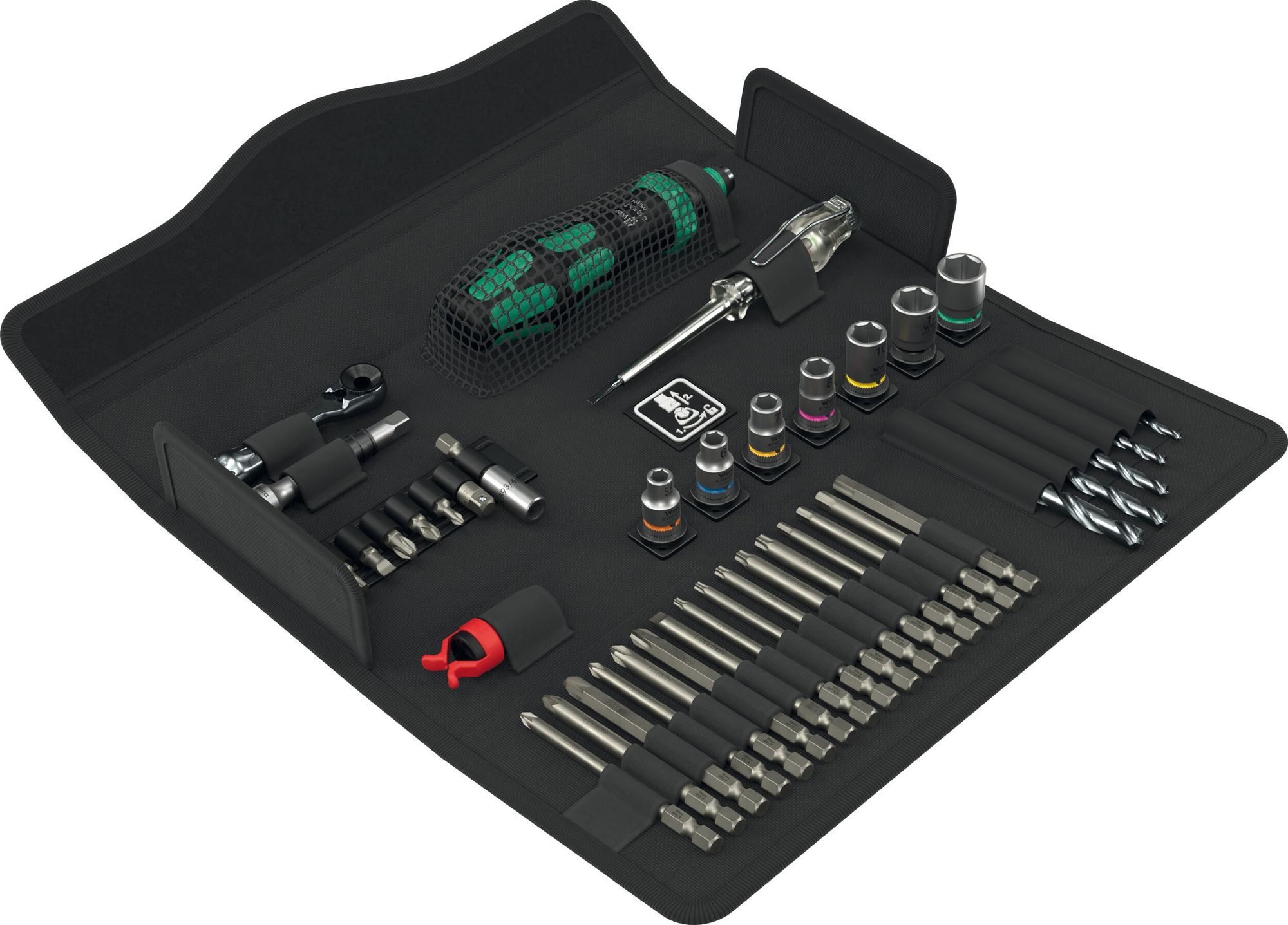 Produktbezeichnung:Kompaktes Werkzeug-Set mit den 41 wichtigsten Schraubwerkzeugen für den Holzbau; mit der robusten Bit-Ratsche Zyklop Mini samt Verlängerung und Nuss-Adapter; 8 Hand- und Maschinennüsse Größe 5,5-13; 1 Ratschen-Handhalter 816 RA mit Ratschenfunktion, Feinverzahnung für geringen Rückholwinkel, Umschaltring (rechts, fest, links), maximales Drehmoment 50 Nm und Bit-Aufnahme mit Rapidaptor-Technologie; 1 Universalbithalter; 6 Bits mit 25mm Länge; 16 Bits mit 89 mm Länge; 5 Holzspiralbohrer-Bits mit Durchmesser 3-8mm; 1 Schraubkralle zum Festhalten von Schrauben; 1 einpoliger Phasentester 247; textile Box mit sehr hoher Robustheit und Langlebigkeit; aufrecht positionierbar zur übersichtlichen Lagerung im Werkstattregal; zusätzlicher Oberflächenschutz durch textiles Außenmaterial; geringes Gewicht und Volumen für vereinfachte Mobilität.Technische Daten:1x 1441 SB Schraubkralle für Schraubendreherklingen, lange Bits und Winkelschlüssel mit Festhaltefunktion für Schrauben: 4,5-6 x 41 mm1x 247 Einpoliger Phasenprüfer: 0,5 x 3 x 70 mm5x 849 HSS Holzspiralbohrer-Bits: 3x70 mm, 4x74 mm, 5x85 mm, 6x95 mm, 8x110 mm1x 800/1 Z Bits: 1 x 5,5 x 25 mm1x 800/4 Z Bits: 1 x 5,5 x 89 mm4x 840/4 Z Bits: 3x89 mm, 4x89 mm, 5x89 mm, 6x89 mm2x 867/1 TORX® Bits: TX 20x25 mm, TX 25x25 mm5x 867/4 Z TORX® BO Bits mit Bohrung: TX 10x89 mm, TX 15x89 mm, TX 20x89 mm, TX 25x89 mm, TX 30x89 mm3x 855/1 Z Bits: PZ 1x25 mm, PZ 2x25 mm, PZ 3x25 mm3x 855/4 Z Bits: PZ 1x89 mm, PZ 2x89 mm, PZ 3x89 mm3x 851/4 Z Bits: PH 1x89 mm, PH 2x89 mm, PH 3x89 mm1x 893/4/1 K Universalhalter: 1/4" x 50 mm7x 8790 HMA Zyklop-Steckschlüsseleinsatz mit 1/4"-Antrieb: 5,5x23 mm, 6x23 mm, 7x23 mm, 8x23 mm, 10x23 mm, 12x23 mm, 13x23 mm1x 8794 SA Zyklop-Verlängerung mit Schnelldrehhülse, kurz, 1/4": 1/4" x 75 mm1x 870/1 Werkzeugschaft (Verbindungsteil): 1/4" x 25 mm1x 8001 A Bit-Ratsche 1/4": 1/4" x 87 mm1x 838 RA-R L Bits-Handhalter mit Ratschenfunktion, 1/4": 1/4" x 140 mmLieferumfang:1x Wera Kraftform Kompakt H 1 Holz, 41-teilig