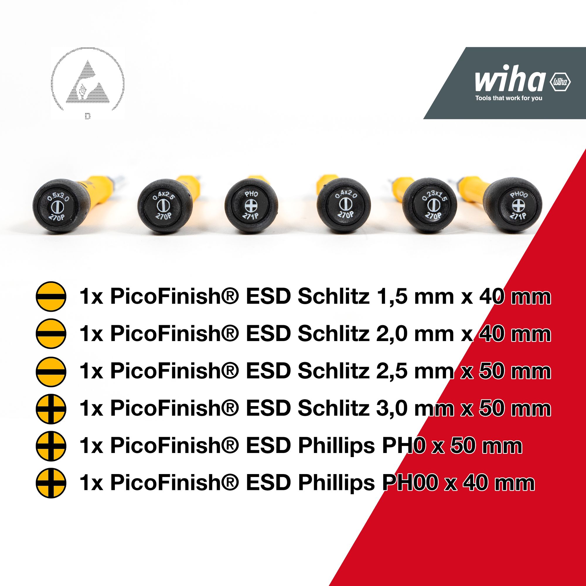 Produkteigenschaften:PRAKTISCH: Vereinfachte Arbeit durch den praktischen Kunststoffhalter zum Aufhängen oder StellenEFFIZIENZ: Das Schraubendreher-Griffgrößenkonzept führt zu einer optimalen Balance zwischen Präzision und KontrolleSCHUTZ: Elektronische Bauteile werden durch die elektrostatisch ableitenden Werkzeuge vor Zerstörung geschütztPRÄZISION: Gefühlvolles Arbeiten und kontrollierte Kraftrtragung dank schlankem Griff mit Softgrip-ZoneHANDHABUNG: Die extra lange Drehkappe des Feinschraubendrehers ermöglicht eine optimale FührungProduktbeschreibungDie Herausforderung beim Arbeiten an elektronischen Bauteilen besteht darin, dass sie schon bei geringsten Spannungen beschädigt werden können. Mit den elektrostatisch ableitenden Feinschraubendrehern PicoFinish® ESD wird diese Aufgabe problemlos gemeistert. Dank ihrer langen, schlanken Griffe und der Schnelldreh-Zone sind die Feinschraubendreher ideal für präzises und gefühlvolles Arbeiten an empfindlichen Werkstücken. Das ergonomische Griffdesign mit Weichzone ermöglicht komfortables Arbeiten. Gefühlvolles und schnelles Drehen wird mit der leichtgängigen Drehkappe unterstützt. Weiterhin erleichtern die aufgedruckten Schraubendrehersymbole auf der Drehkappe die Auswahl des richtigen Schraubendreherprofils. Im Set sind 6 Feinschraubendreher PicoFinish® und ein Halter enthalten. Mit letzterem können die Feinschraubendreher ordentlich am Arbeitsplatz aufbewahrt werden. Das dissipative Werkzeug leitet elektrostatische Energie kontrolliert und sicher ab. Die ESD Feinschraubendreher sind gemäß der internationalen Norm IEC 61340-5-1 gefertigt und garantieren somit einen maximalen Schutz der elektronischen Komponenten. Die Schraubendreher haben einen Oberflächenwiderstand von 106 - 109 Ohm.AnwendungIdeal für feine und filigrane Schraubarbeiten an elektrostatisch gefährdeten Bauteilen.Technische Daten:Werkzeug für Elektrik: NeinSB - Verpackung: NeinESD Artikel: Jamit Batterie / Akku: NeinLieferumfang:Wiha Feinschraubendreher Set PicoFinish® ESD Schlitz, Phillips 7-tlg. inkl. Halter (43707):1x Feinschraubendreher PicoFinish® ESD Schlitz 1,5 mm x 40 mm (43669)1x Feinschraubendreher PicoFinish® ESD Schlitz 2,0 mm x 40 mm (43670)1x Feinschraubendreher PicoFinish® ESD Schlitz 2,5 mm x 50 mm (43671)1x Feinschraubendreher PicoFinish® ESD Schlitz 3,0 mm x 50 mm (43672)1x Feinschraubendreher PicoFinish® ESD Phillips PH0 x 50 mm (43677)1x Feinschraubendreher PicoFinish® ESD Phillips PH00 x 40 mm (43676)1x Halter