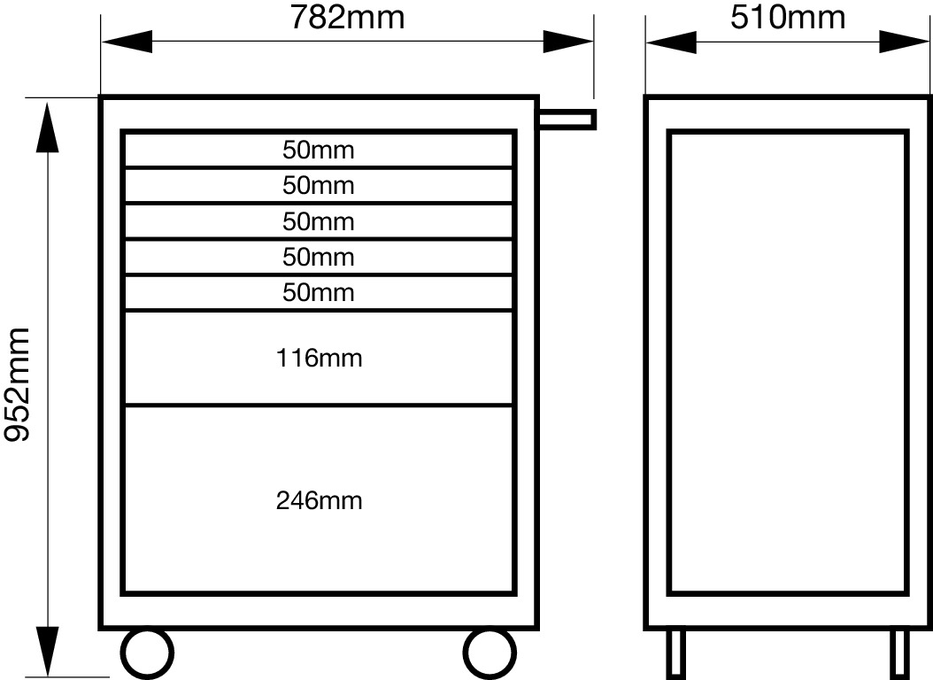 Produkteigenschaften: Robuster Werkstattwagen mit 7 Schubladen, basierend auf einer doppelwandigen Konstruktion Vollständig öffnende Schubladen mit kugelgelagerten, geschmeidig gleitenden Führungsschienen mit einer Tragfähigkeit von bis zu 30 kg Die Gummirollen sorgen für maximale Stabilität und leichte Manöverierbarkeit des Werstattwagens auch auf unebenen Untergründen An den Aufnahmen in den Seitenteilen kann unterschiedliches, optionales Zubehör befestigt werden. Widerstandsfähiges und sicheres Schließsystem mit Zentralverriegelung schützt vor Diebstahl des Inhaltes Kratzfeste Pulverbeschichtung außen und innen für bestmöglichen Rostschutz Der Kantenschutz an den Seiten schützt vor Verletzungen und Schäden an Objekten in der Umgebung Das doppelwandige Gehäuse schützt bei Kollisionen, sodass die Schubladen auch weiterhin geöffnet werden können Eine umfangreiche Auswahl an Fit&Go Werkzeugsätzen in Schaumstoffeinlage ist erhältlichTechnische Daten: Belastbarkeit: 600 kg Schubladentragekraft: 30 kg Größe: 950x675x500 mmLieferumfang: 1x Bahco Werkstattwagen mit 7 Schubladen, orange (RAL 2009), 1472K7