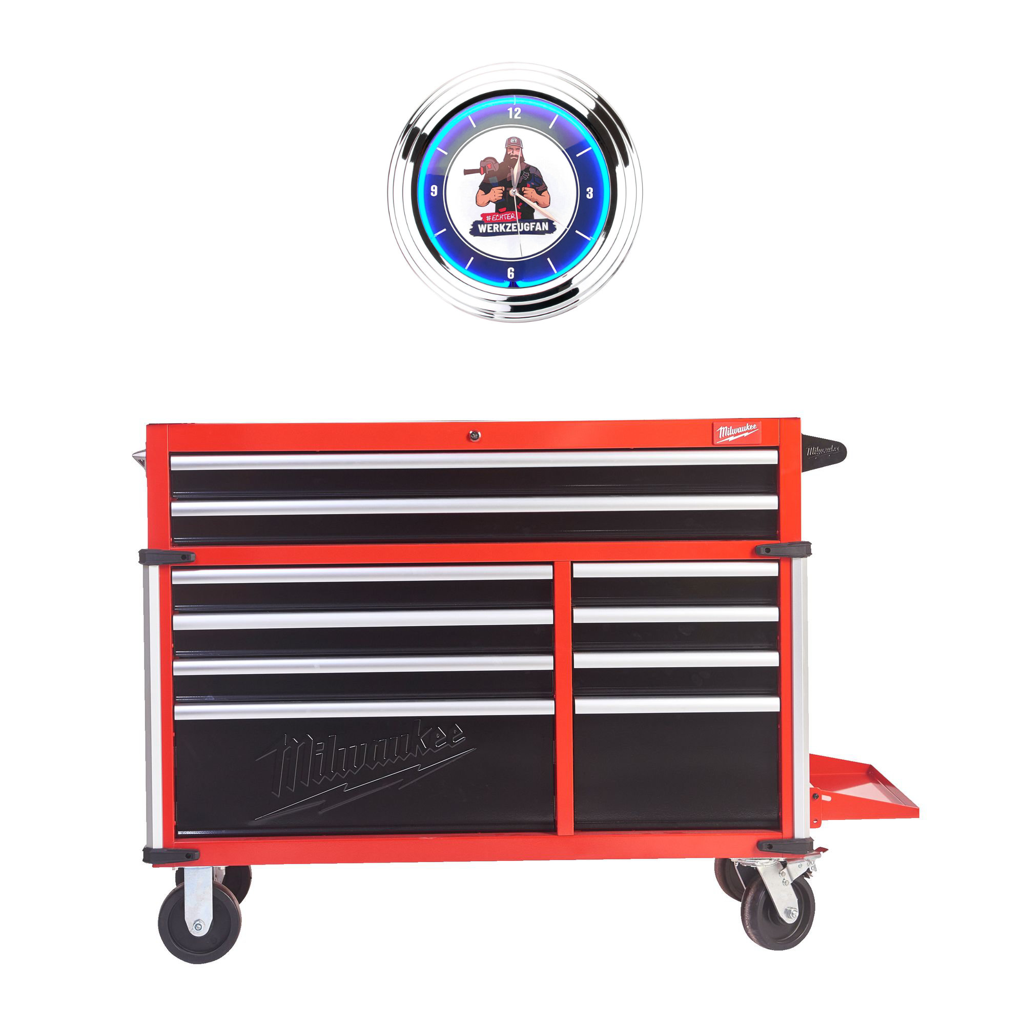 Deutschland www.milwaukeetool.eu/service/contact/ +49210396000 Milwaukee Werkstattwagen-Set mit 10 Schubladen 117 cm / 46" SRC46-1 + Echter Werkzeugfan Neon Werkstattuhr Artikel-Nr.: SRC46-1-A1 EAN: 4250845569798 Hersteller: MILWAUKEE