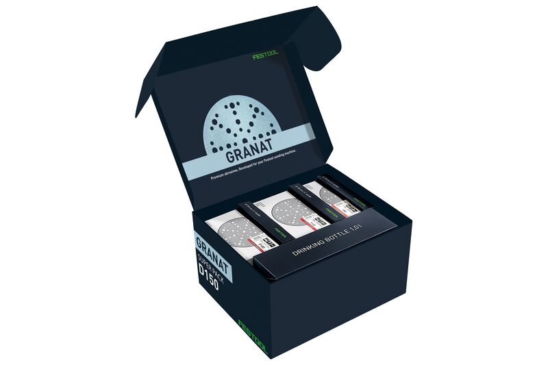 Lieferumfang:1x Festool Schleifmittel-Set Super Pack Granat STF D150/48 GR-SP P + Trinkflasche